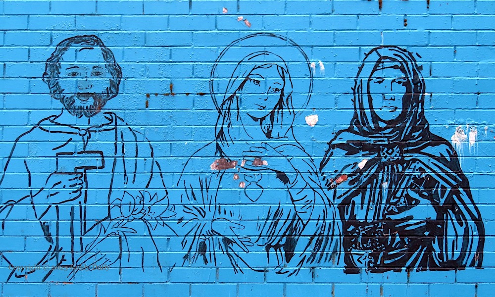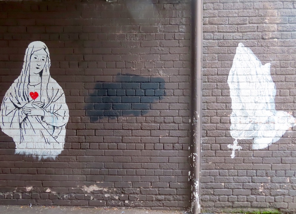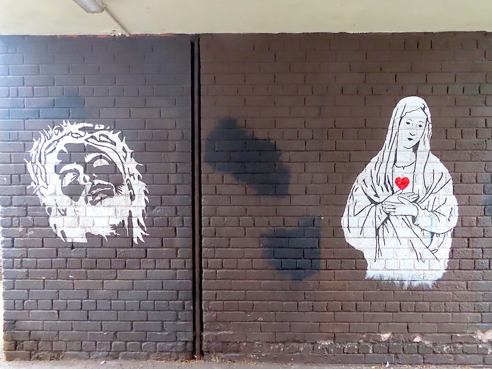 Mary, the mother of Jesus, is remembered in various guises around the New Lodge Grotto. Above, and in the underpass, she takes the form of the ‘Immaculate Heart Of Mary’ (alongside St. Joseph the carpenter and St Patrick(?)).