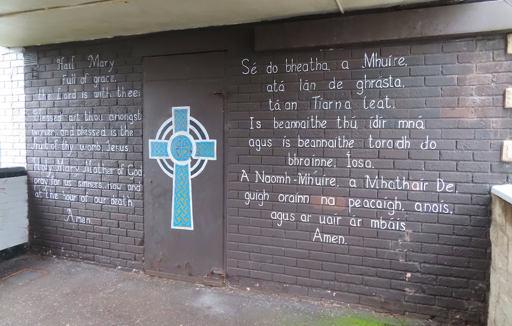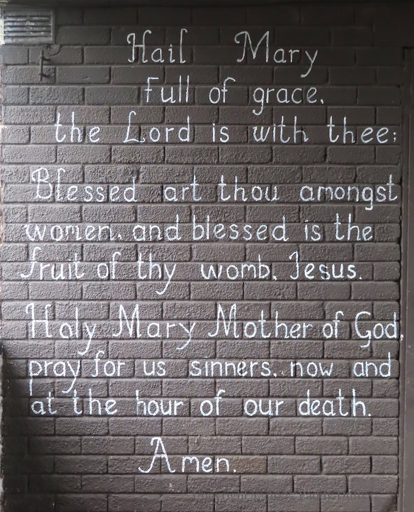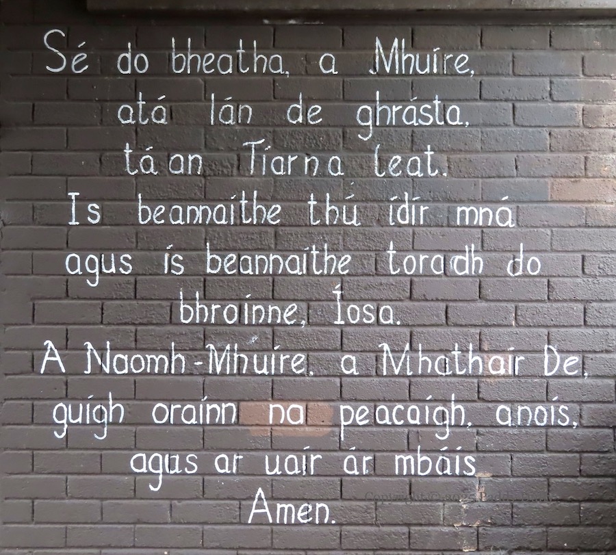 The ‘Hail Mary’ is also given, in English (Hail, Mary, full of grace, the Lord is with thee. Blessed art thou amongst women and blessed is the fruit of thy womb, Jesus. Holy Mary, Mother of God, pray for us sinners, now and at the hour of our death. Amen.) and in Irish (Sé do bheatha, a Mhuıre, atá lán de ghrásta. Tá an Tıarna leat. Is beannaıthe thú ıdır mná, agus ıs beannaıthe toradh do bhroınne, Íosa. A Naomh-Mhuıre, a Mháthaır Dé, guıgh oraınn na peacaıgh, anoıs, agus ar uaır ár mbáıs. Amen.)