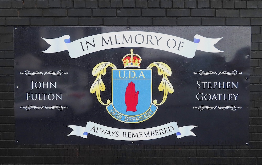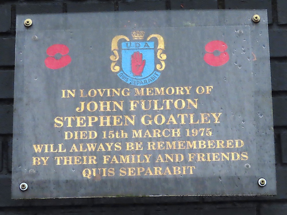 “In loving memory of John Fulton [and] Stephen Goatley, died 15th March 1975. Will always be remembered by their family and friends. Quis separabit.” UDA members John Fulton and were Stephen Goatley were killed together in the Alexandra Bar on York Road (close to the Mervue Street location of this memorial) in revenge for the stabbing of the UVF’s Joe Shaw in the North Star Bar. , by the UVF as part of the UDA-UVF feud in 1975.