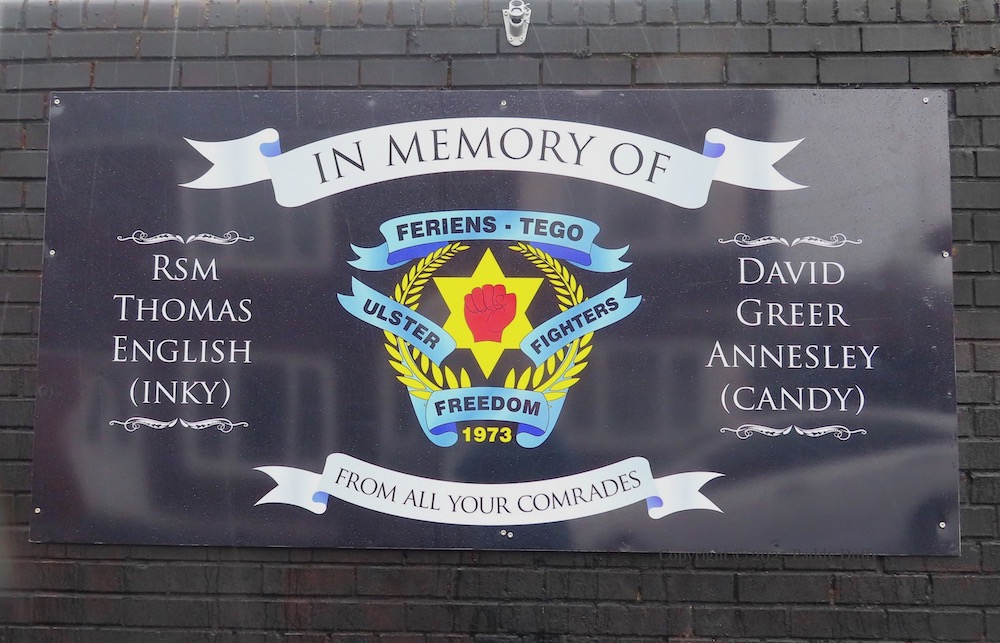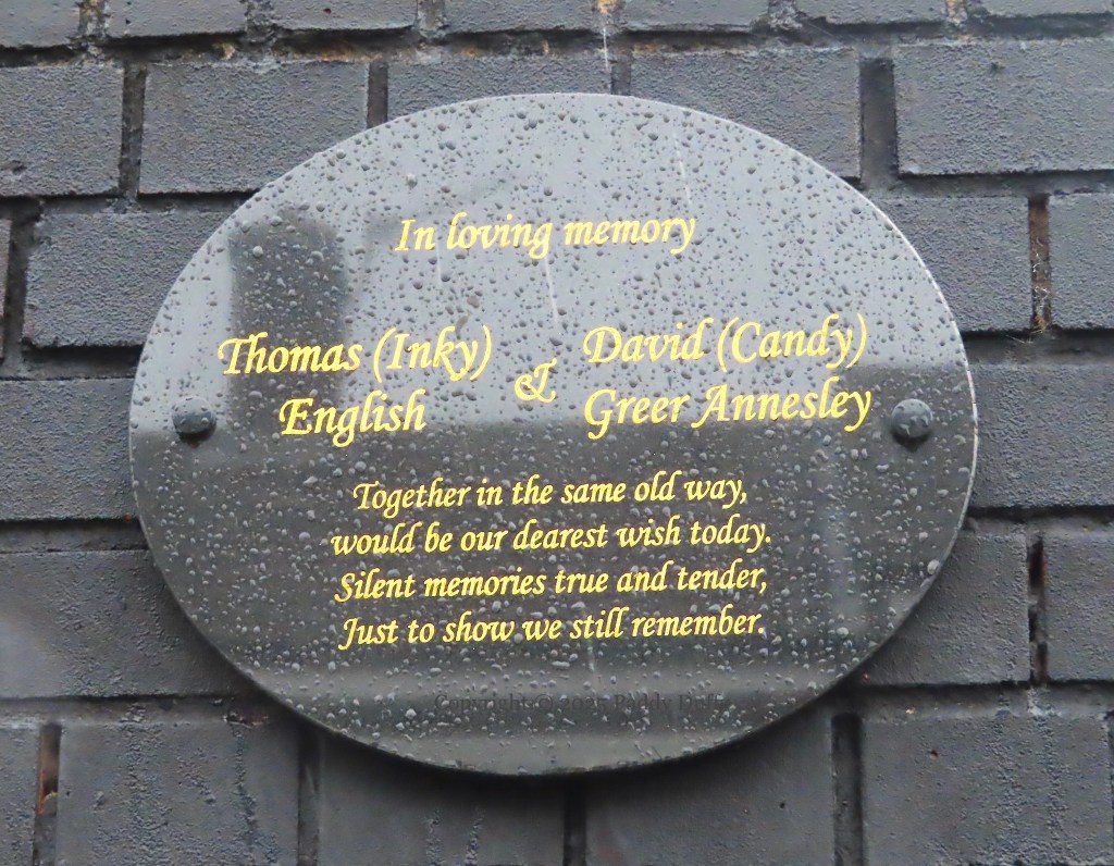 The two men named on the other board were also killed in a feud between the UDA and UVF, in 2000 – see Inky & Candy. “In loving memory Thomas (Inky) English & David (Candy) Greer Annesley. Together in the same old way/would be our dearest wish today./Silent memories true and tender/just to show we still remember.”
