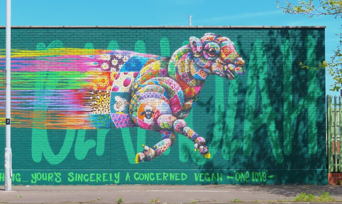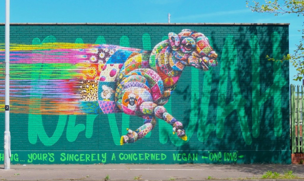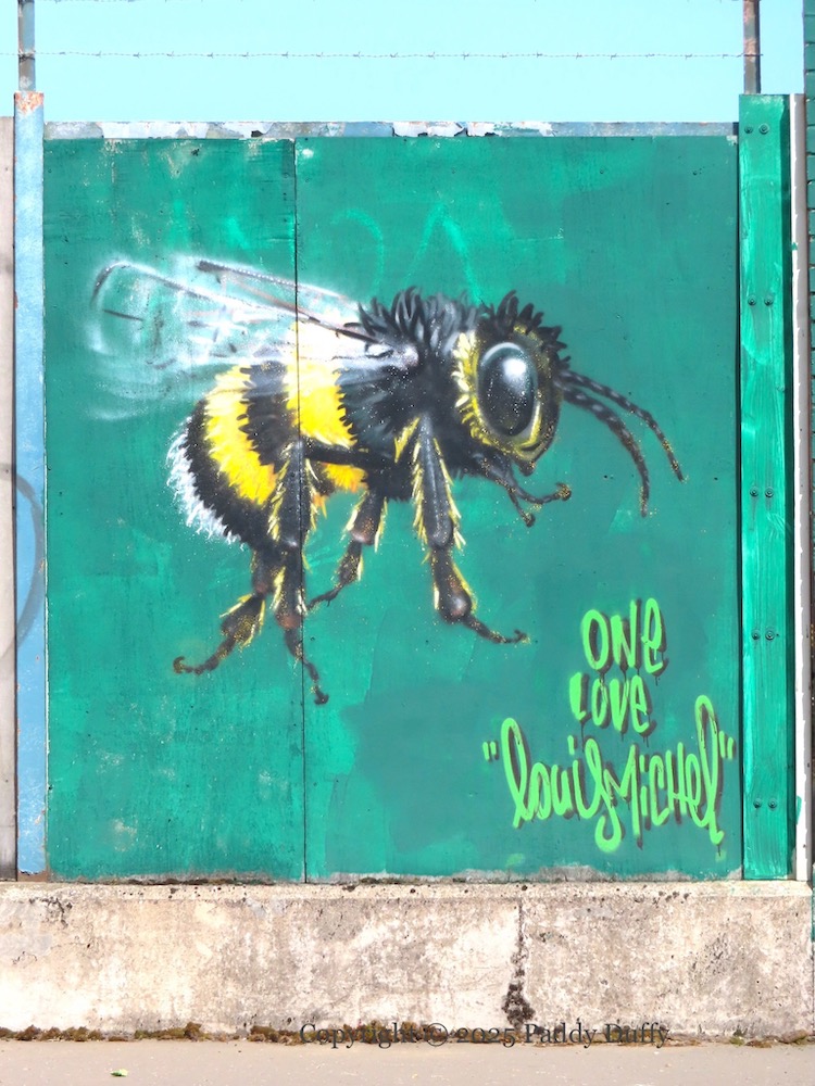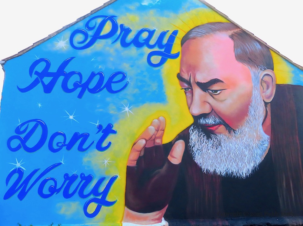 This is a giant image of Padre Pio painted by Cha Cha (Carla Hodgson) (ig) inside the Harcourt Drive gates of what is now St Columban’s – Sacred Heart Boys primary school merged with Our Lady’s Girls to form St Columban’s primary last year (2024) (Belfast Media).