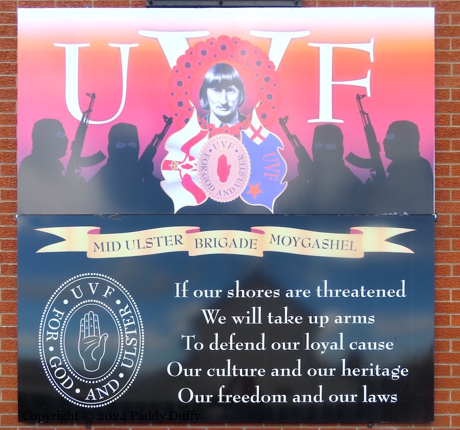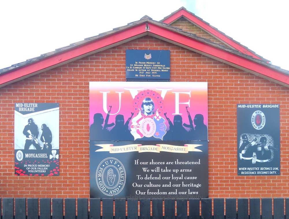 “If our shores are threatened/We will take up arms/To defend our loyal cause/Our culture and our heritage/Our freedoms and our laws.” Moygashel’s own (William) Wesley Somerville, a member of both the UVF and UDR, was killed by a bomb prematurely exploding as he placed it on the minibus of the Miami Showband in July of 1975. Three members of the band died, one of them Protestant, along with volunteers Somerville and Harris Boyle from Portadown (WP). “He died for Ulster” (on the plaque).