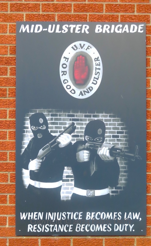 This memorial plaque is “in memory of [LVF] Brigadier Billy Wright (King Rat)”. Wright was killed in the Maze in December 1987 by members of the INLA (neither the INLA or LVF were on ceasefire).