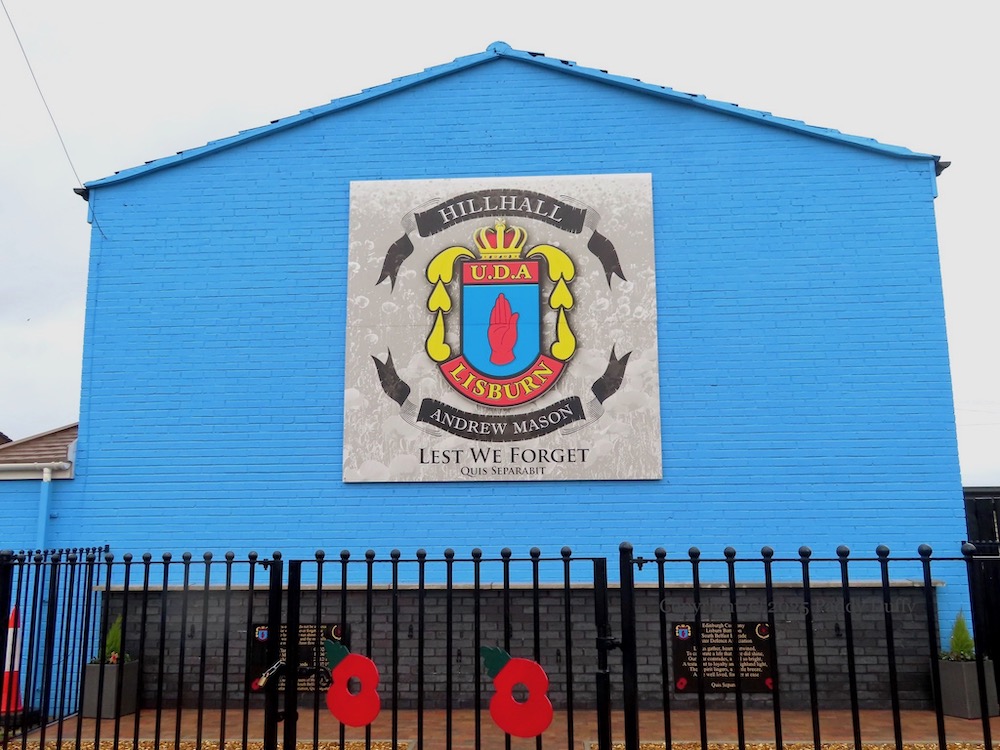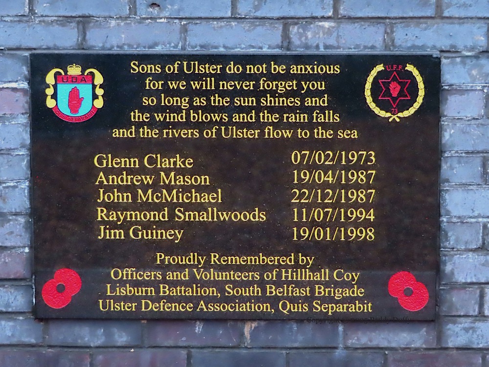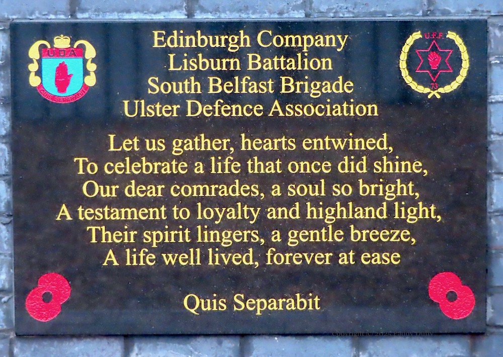 The entirely new plaque on the right reads: “Edinburgh Company, Lisburn Battalion, South Belfast Brigade, Ulster Defence Association – ‘Let us gather, hearts entwined,/To celebrate a life that once did shine,/Our dear comrades, a soul so bright,/A testament to loyalty and highland light,/Their spirit lingers, a gentle breeze,/A life well lived, forever at ease.'” “Edinburgh Company” perhaps indicates the source of the funds that made the modifications possible.