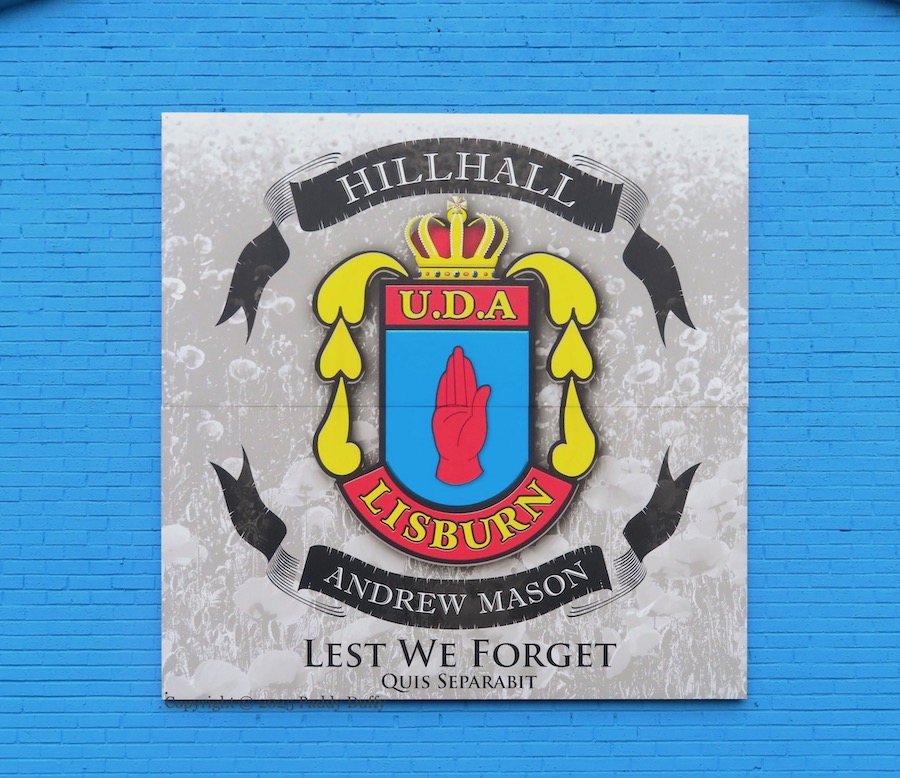 The Andrew Mason memorial garden in Hillhall, Lisburn, has been revamped, with a blue background on the gable wall, the removal of two small bronze plaques below the board (for which see the Peter Moloney Collection), a rebuilt lower wall to which two new plaques have been added, and an expanded “garden” with new fencing.