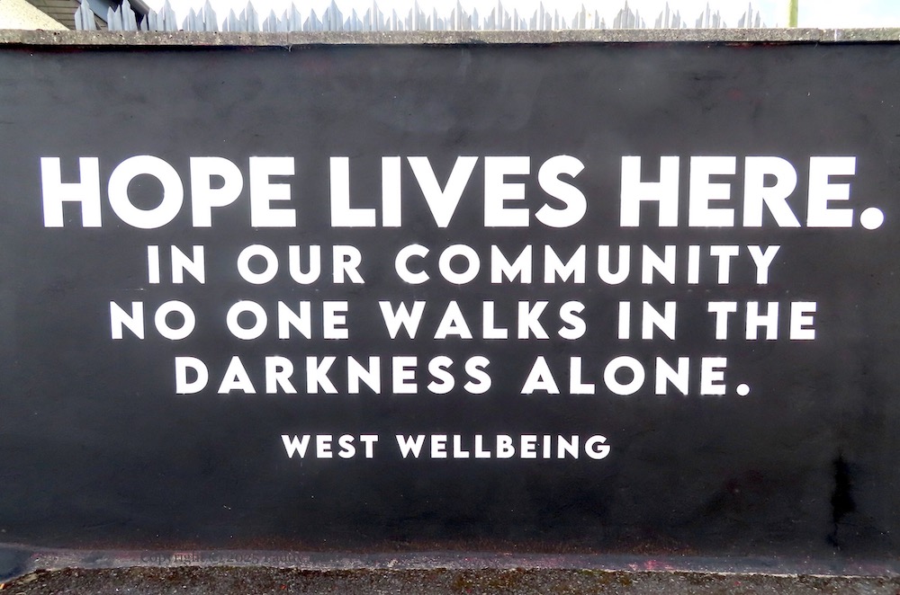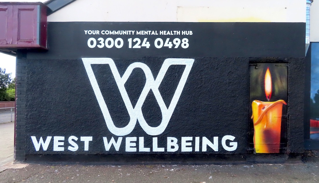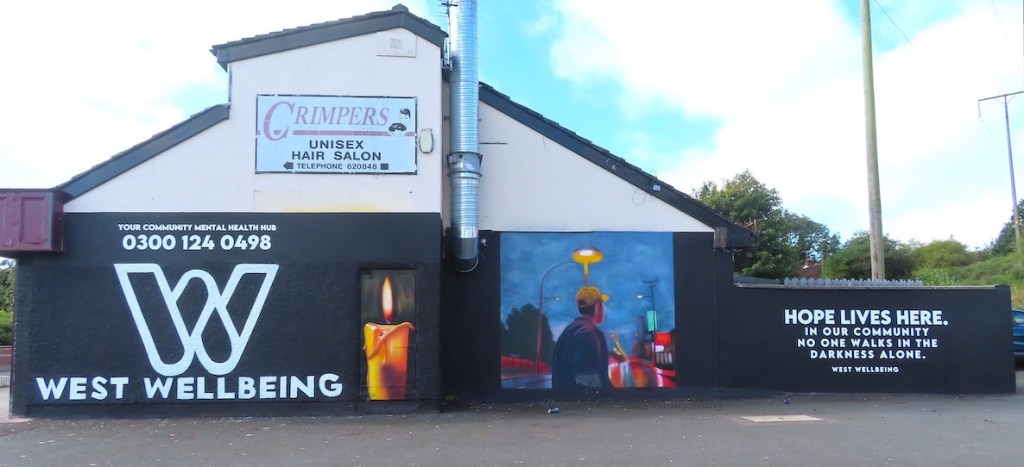 “In our community no one walks in the darkness alone.” West Wellbeing (web) offers counselling and suicide-prevention services from its offices in the Dairyfarm centre on the Stewartstown Road. This new mural – by Glen Molly (ig) – is a little further along the road, just past Bell Steel Road.