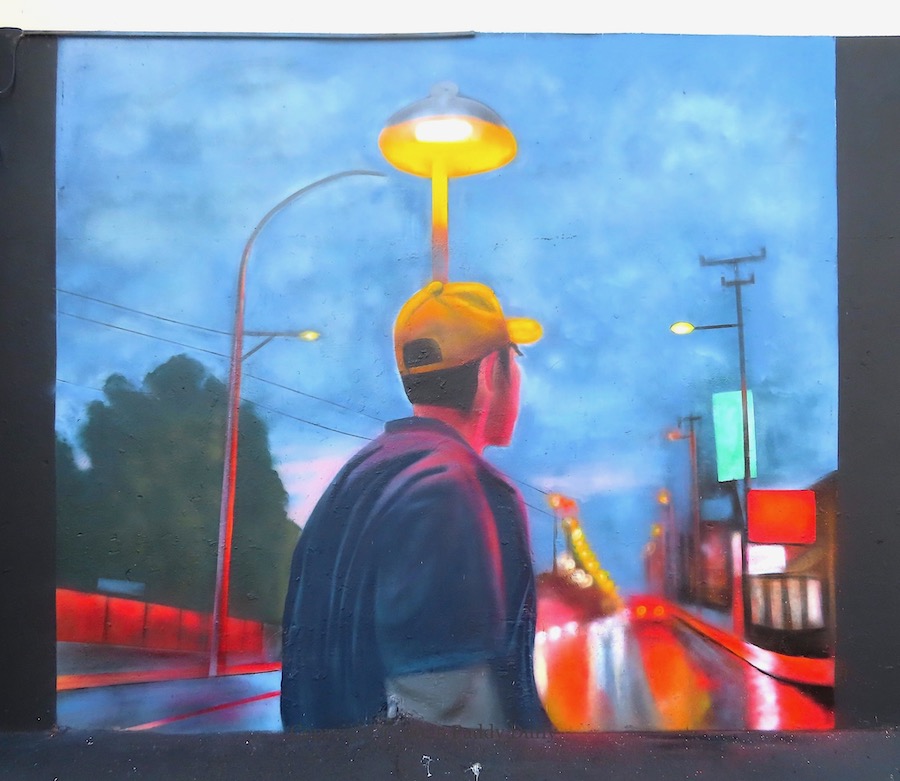 This new mural is in grey-scale except for McCullough’s distinctive red helmet with a green shamrock and red hand. Painted by JMK (ig); the photo reproduced can be seen on the Triumph Motorcycle forum.