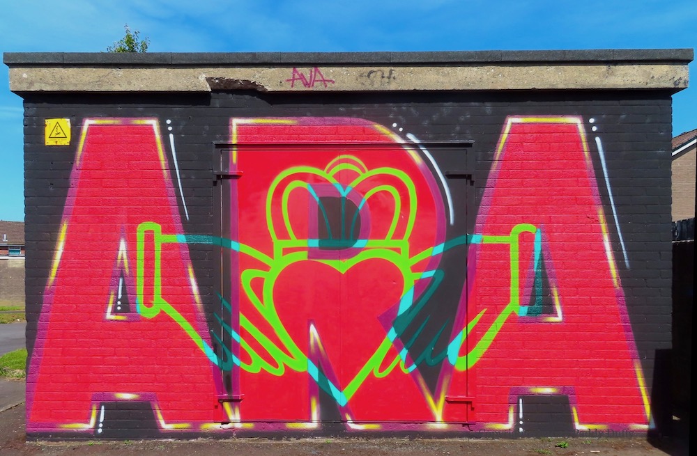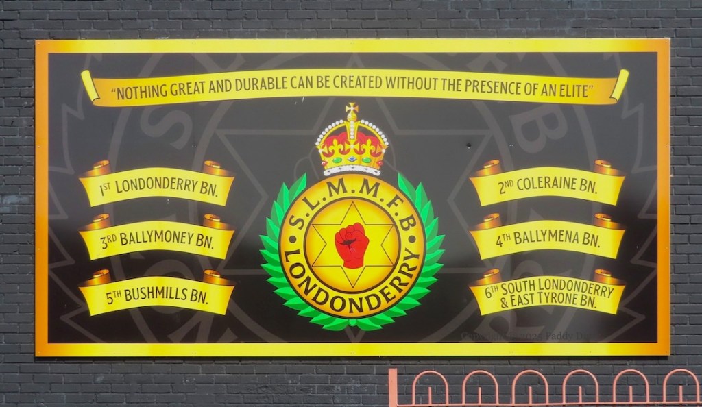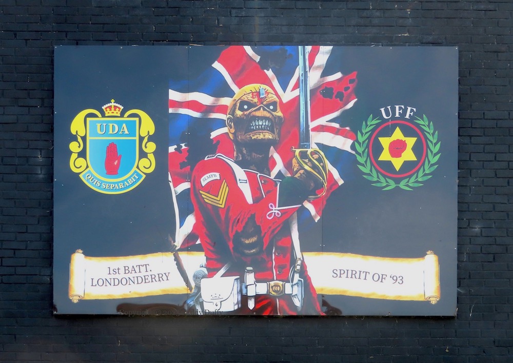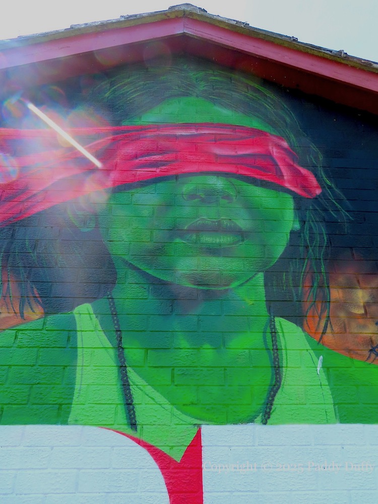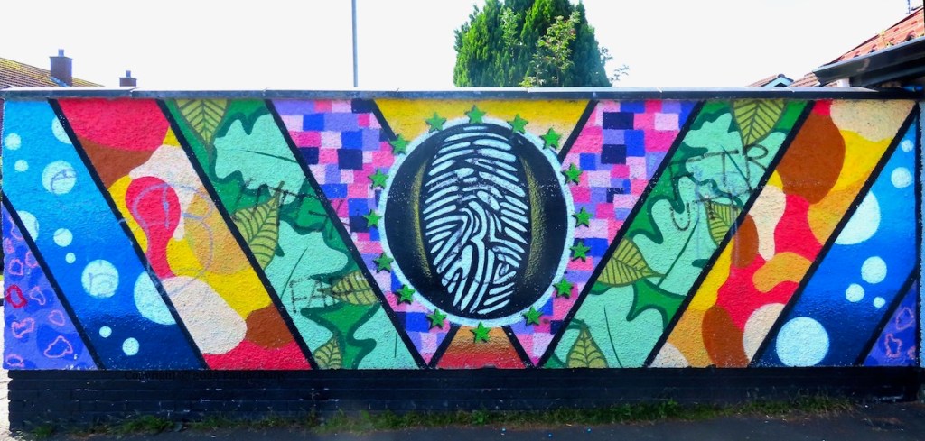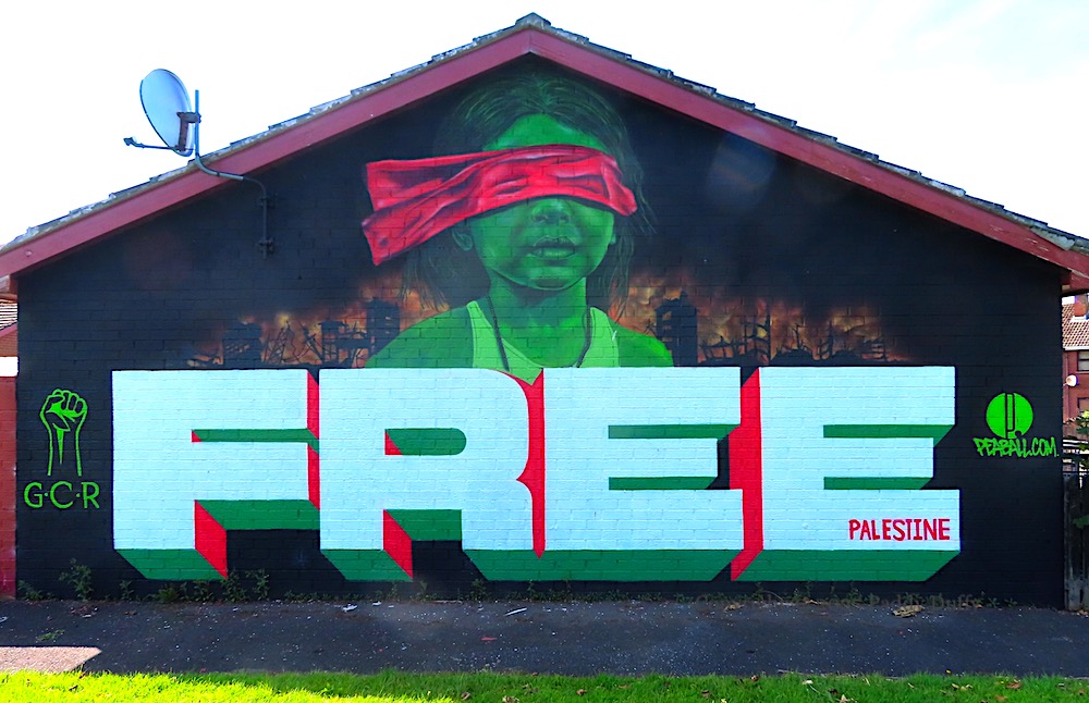 This new mural by Peaball (web) and GCR [Galliagh Community Response (Fb)] shows a blind-folded child in a war-torn landscape.