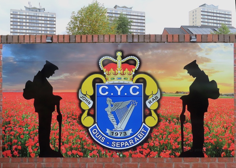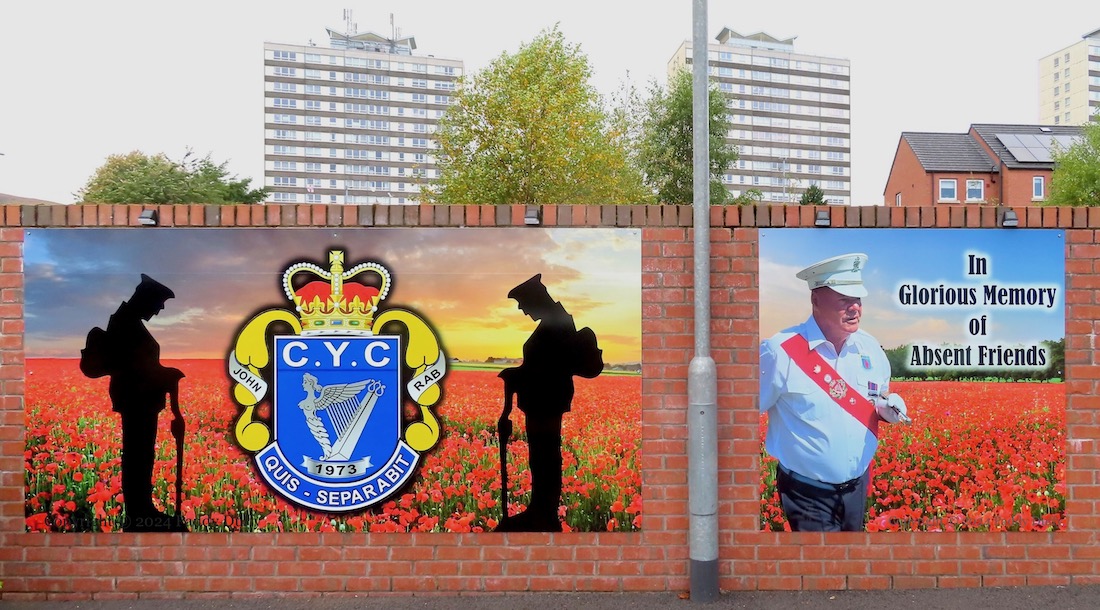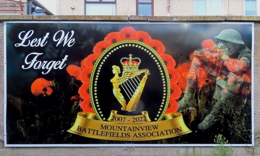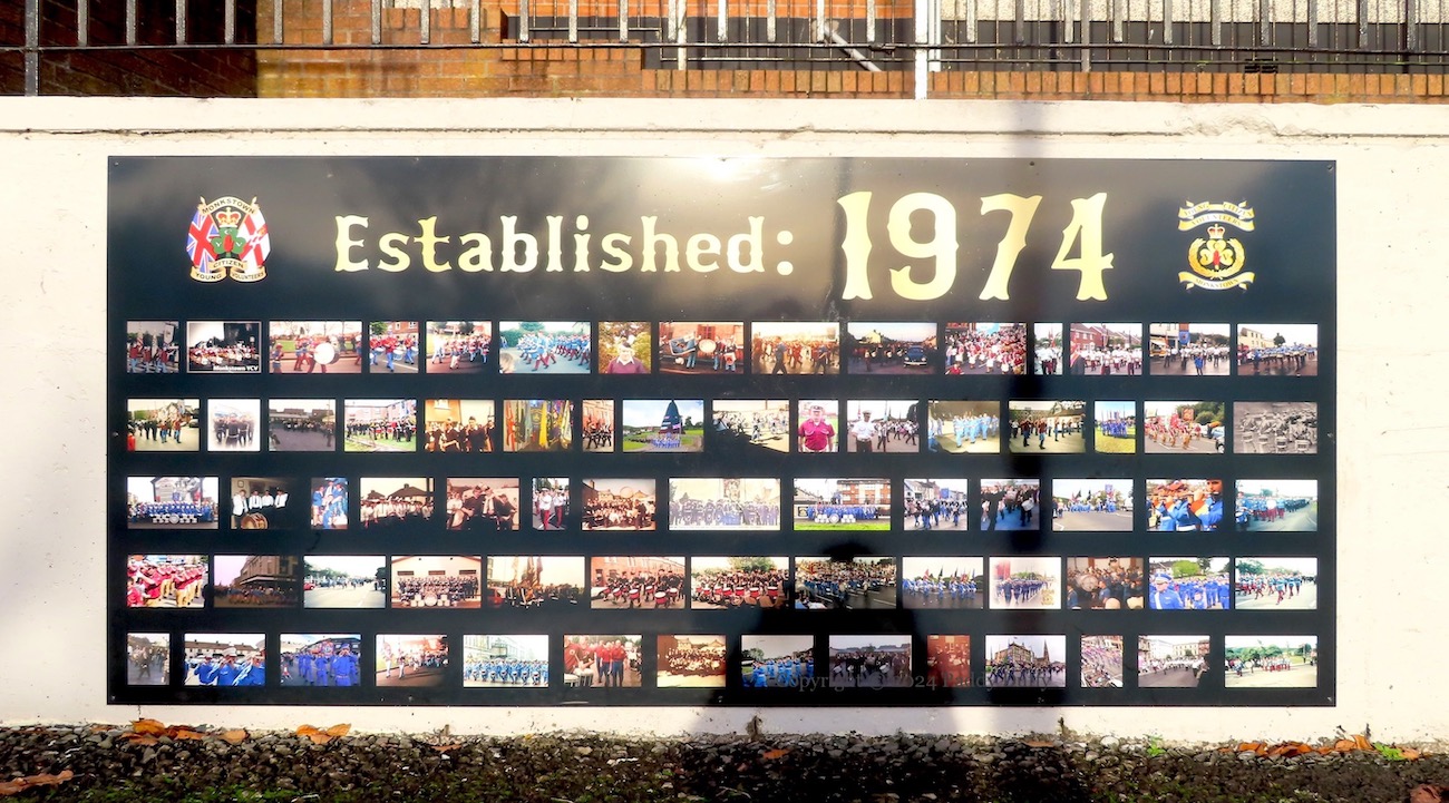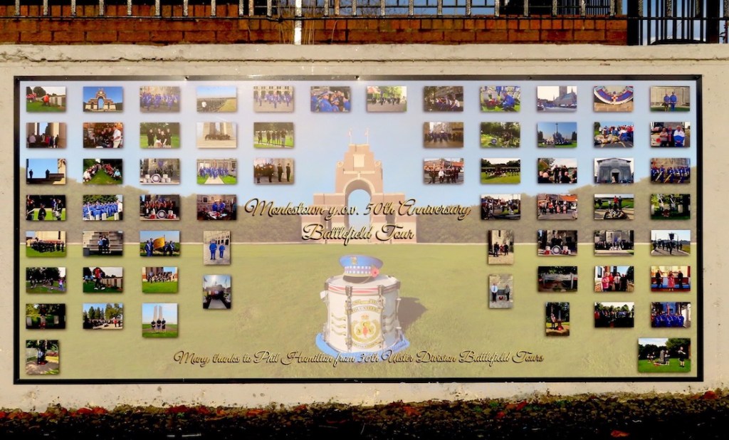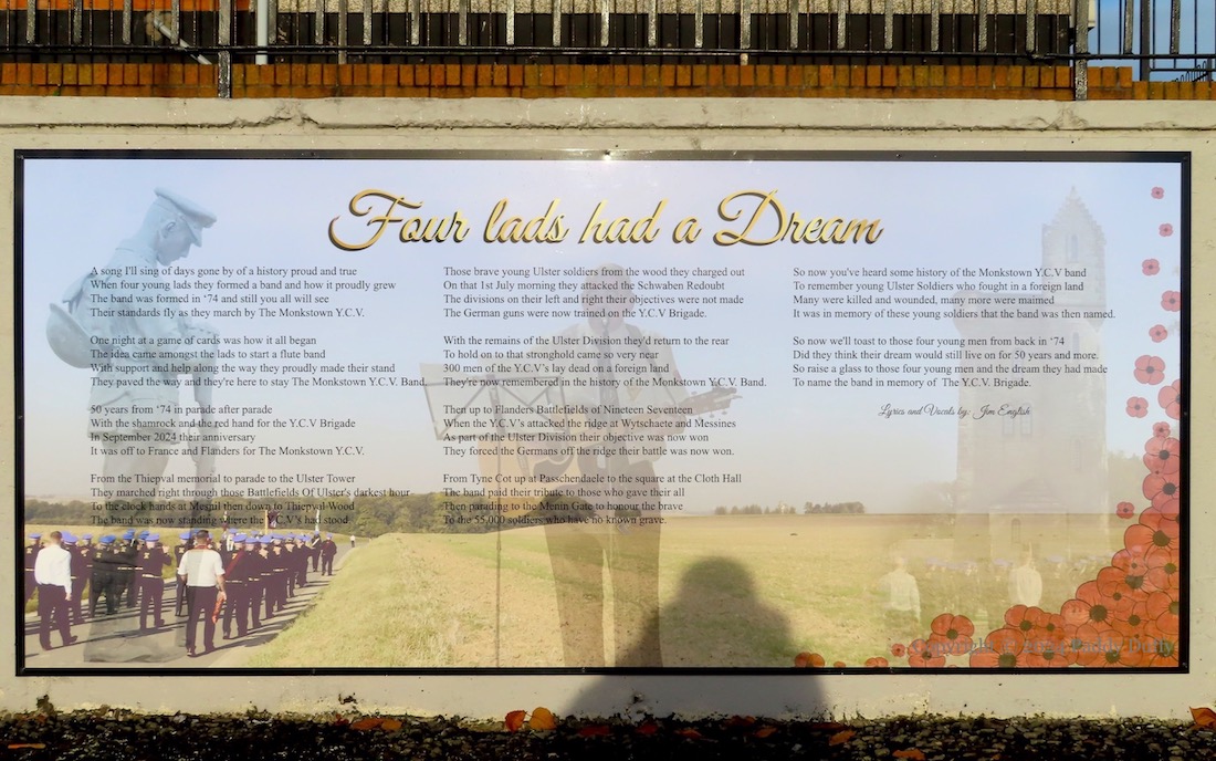 This entry updates Four Lads Had A Dream, which showed seven boards on the low wall opposite the Monkstown social club. Three more boards have been added to the right-hand end of the wall. One (above) has a gallery of photographs from the history of the Monkstown YCV flute band (Fb) “established 1974”, the second gives the lyrics to a song by Jim English, which was written for the band’s “50th anniversary battlefield tour” (Fb), photos from which are shown in the third panel.