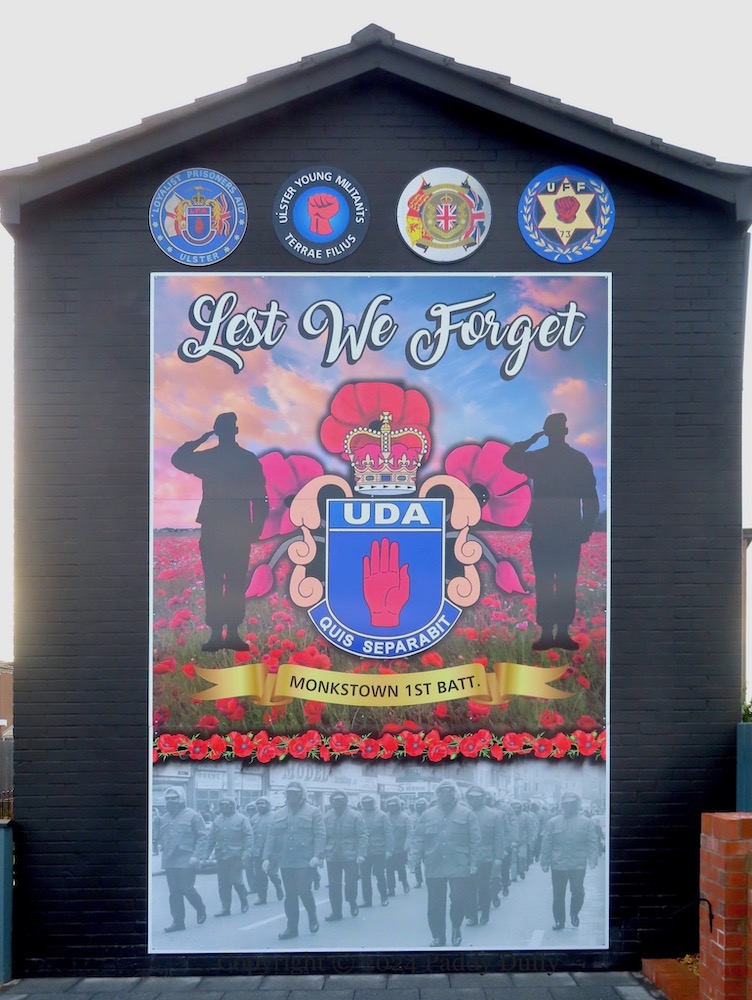 “This memorial is dedicated to the memory of the officers and members of our organisation who were murdered by the enemies of Ulster and to those who paid the supreme sacrifice whilst on active service during the present conflict. Quis separabit.” Four of the 1st battalion dead are named in the mural across Devenish Drive – see Monkstown UDA.