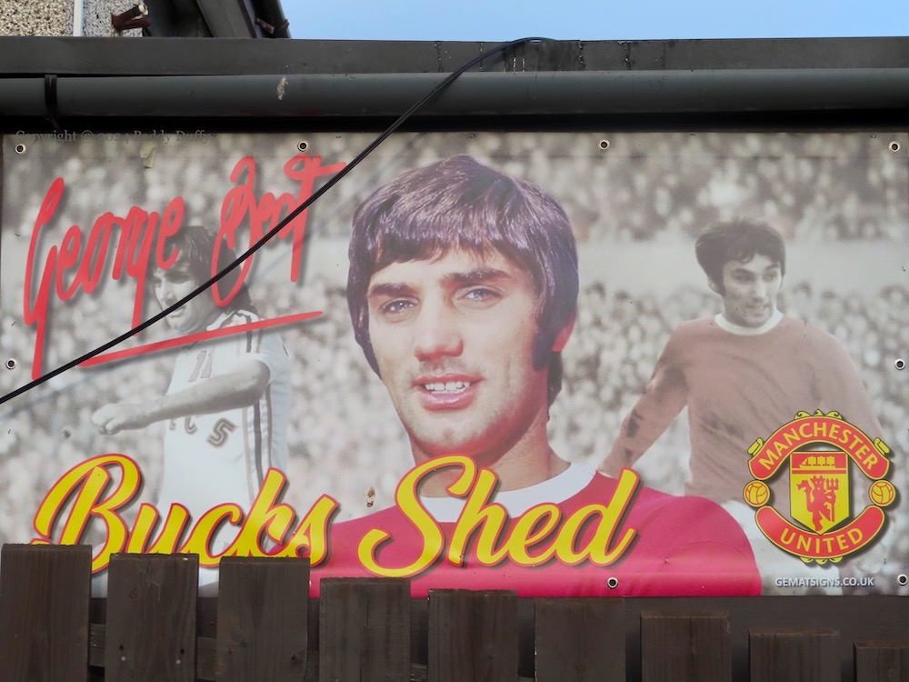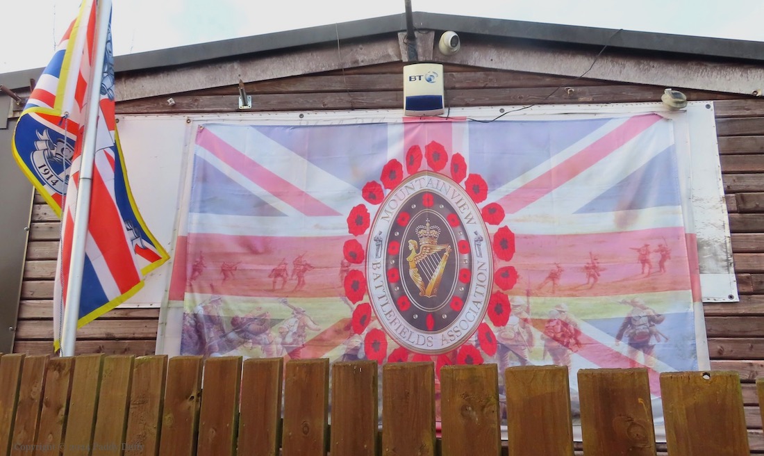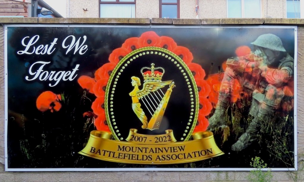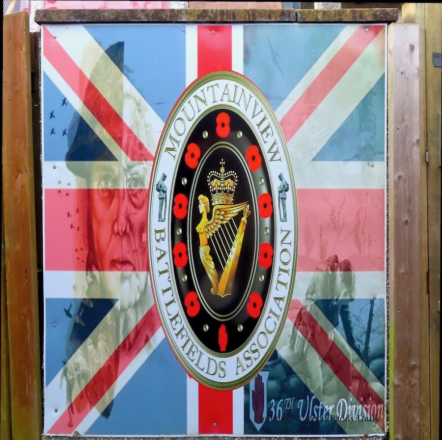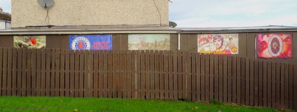 Here is a gallery of images of the boards and flags on the fencing around “Buck’s Shed” in Rathfern, Newtownabbey. The usual themes are represented: the 36th Division and WWI (Mountainview Battlefields Association Fb), the British military, Rangers FC, and George Best.
