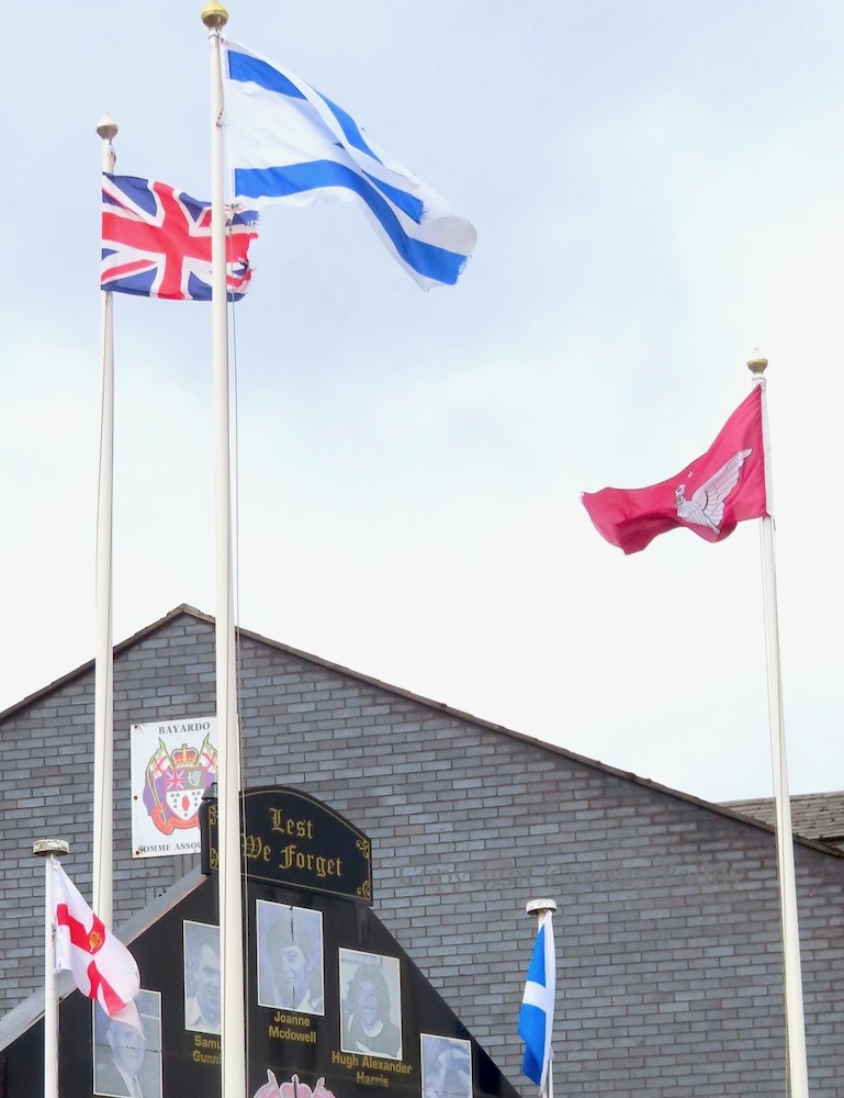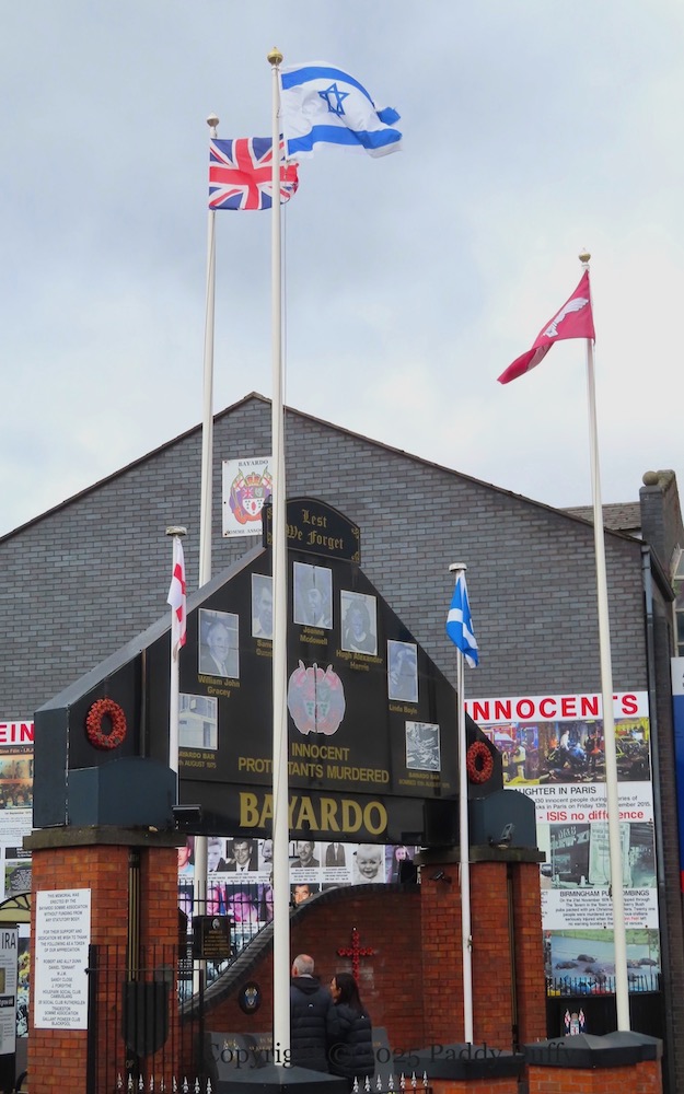 The flags of the Paratroop Regiment and Israel fly alongside the Union Flag over the Bayardo memorial on the Shankill Road, west Belfast. The boards around the wall present photographs of bombings and killings under headings such as ‘Children murdered by Sinn Fein – IRA‘, ‘Sinn Fein/IRA’s Slaughter Of The Innocents’, ‘IRA – Sinn Fein – ISIS no difference‘.