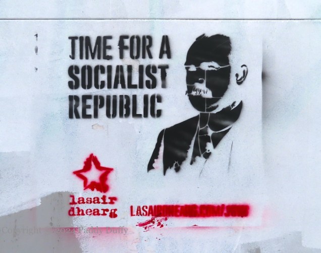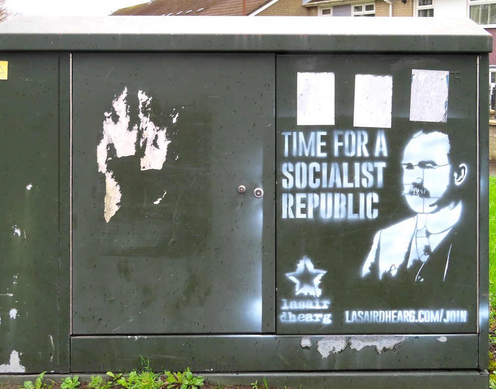 These Lasaır Dhearg (web) stencils and stickers also propose that it is “time for a socialist republic” (drawing inspiration from James Connolly) and that “the PSNI is not a normal police force” (for background see Just Don’t in the Seosamh Mac Coılle collection).