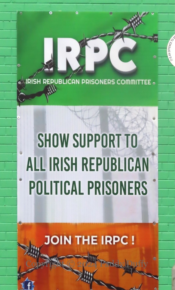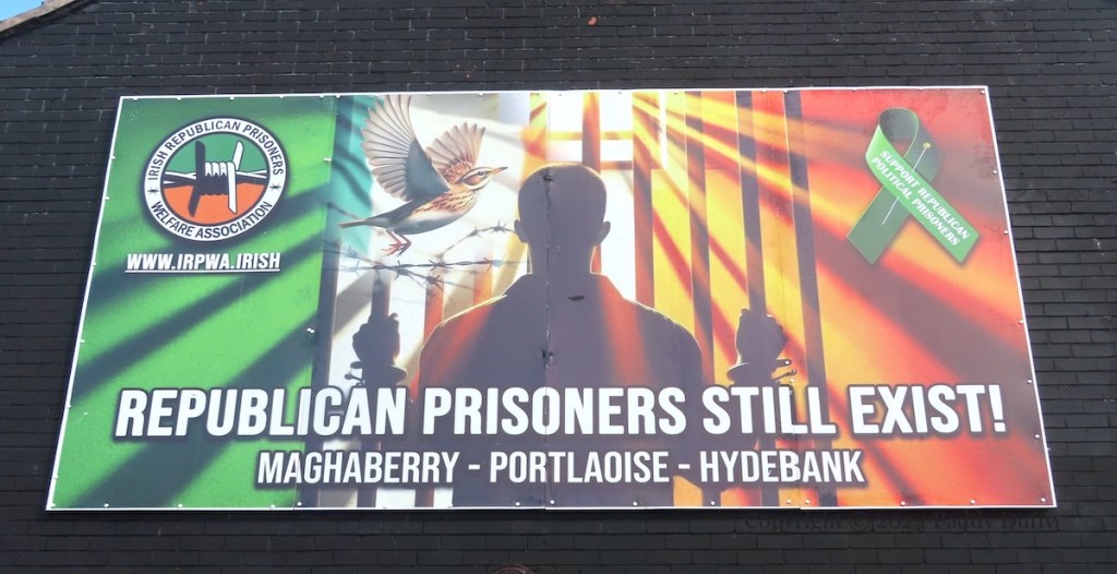 Below: “Support republican political prisoners” in “Maghaberry – Portlaoise – Hydebank”. IRPWA (web) board in Ardoyne Avenue, north Belfast. See also: the same message on Divis Street, west Belfast.