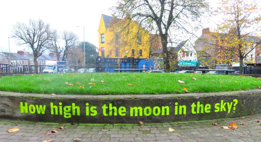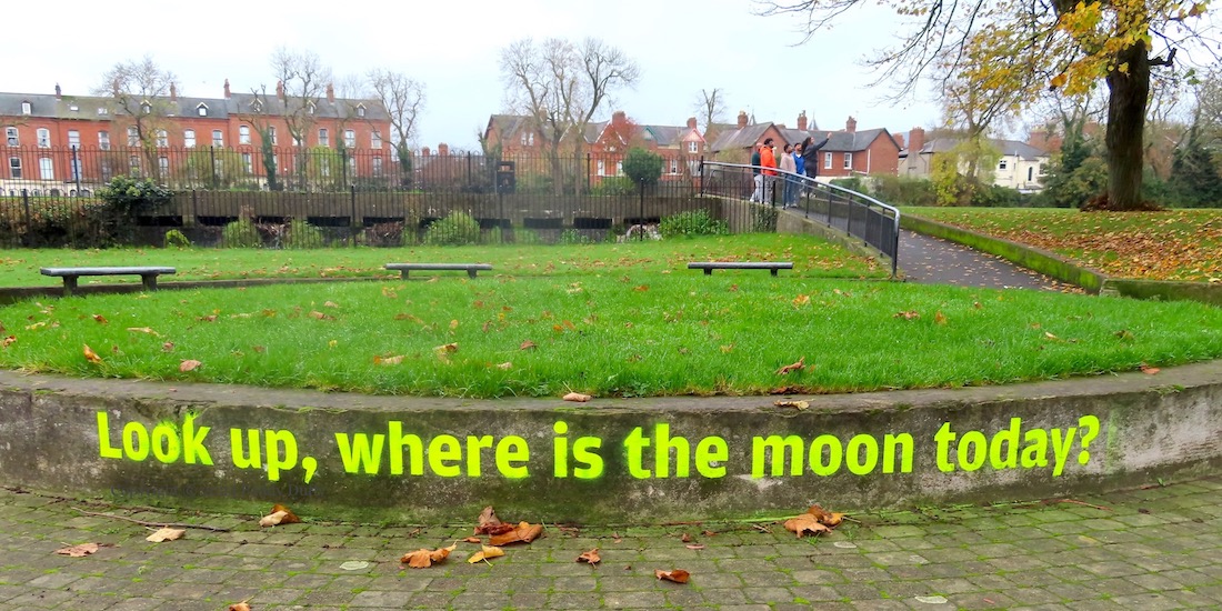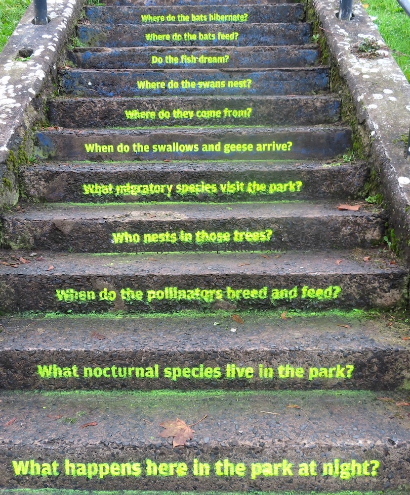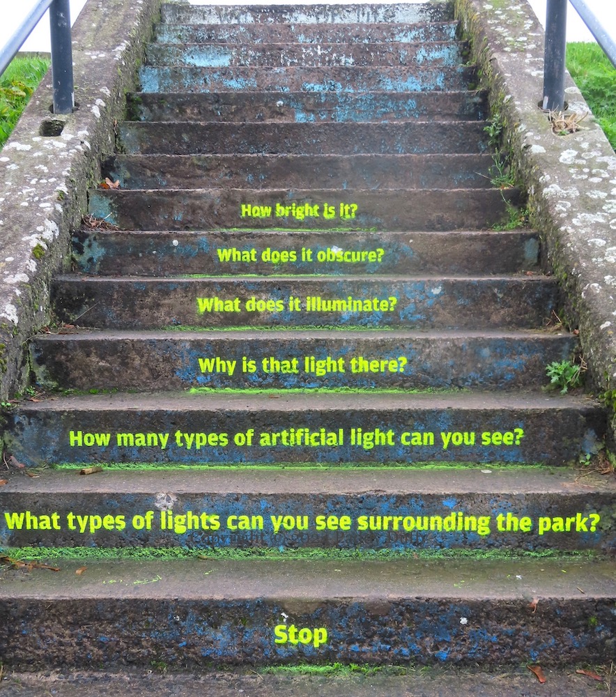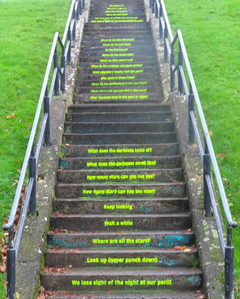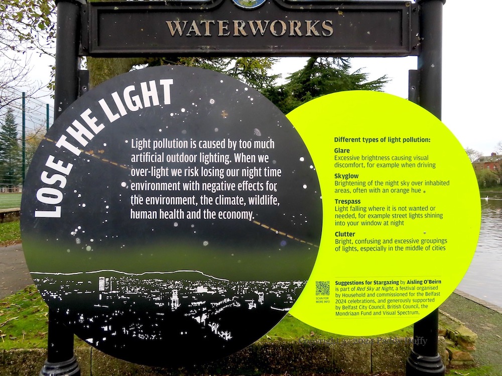 ‘Suggestions For Stargazing’ is a series of information boards and fluorescent questions encouraging people to embrace darkness. The installation was designed by Aisling O’Beirn (web) as part of the Right To The Night (ig) project, which is concerned with light pollution in north Belfast, and was included in the Red Sky At Night festival (Belfast CC). It will remain in place until the end of November, 2024.