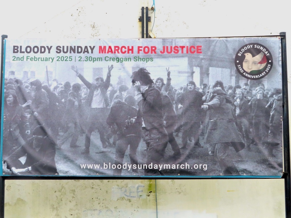 This was the banner on the back of Free Derry Corner announcing the (53rd) annual march in remembrance of Bloody Sunday, which starts from the Creggan shops and makes its way down to the Bogside, retracing the route taken in 1972. The march goes up Westland Street and across to Creggan Street and William Street. The background image shows the crowd (in 1972) in William Street a minute before the paratroop regiment opened fire. For the original Gilles Peress photograph (and a flyer using it in Derry in 1996), see And The Next Moment …