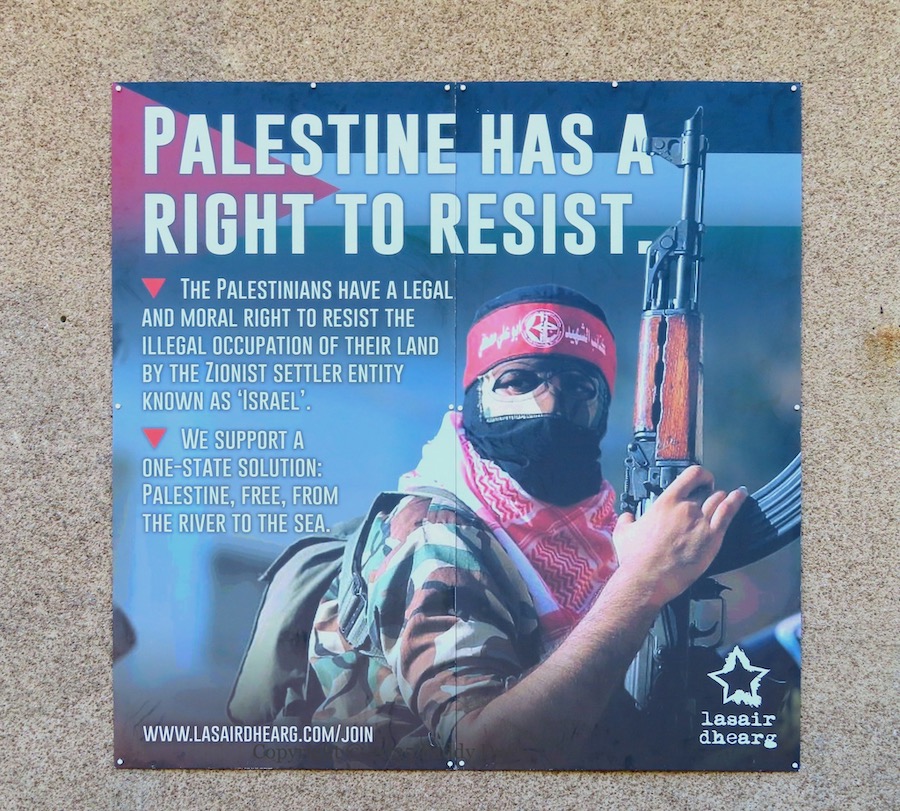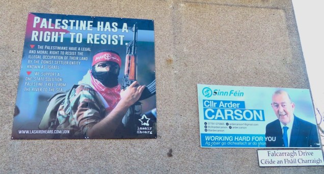 This Lasaır Dhearg (web) board in Lenadoon is explicit in defending the use of physical force by Palestinians (specifically by the Popular Front For The Liberation Of Palestine – WP): “Palestine has a right to resist. The Palestinians have a legal and moral right to resist the illegal occupation of their land by the Zionist settler entity known as ‘Israel’. We support a one-state solution: Palestine, free, from the river to the sea.”