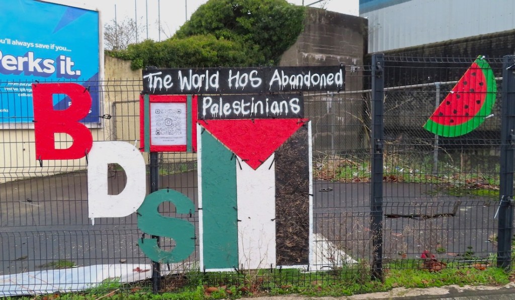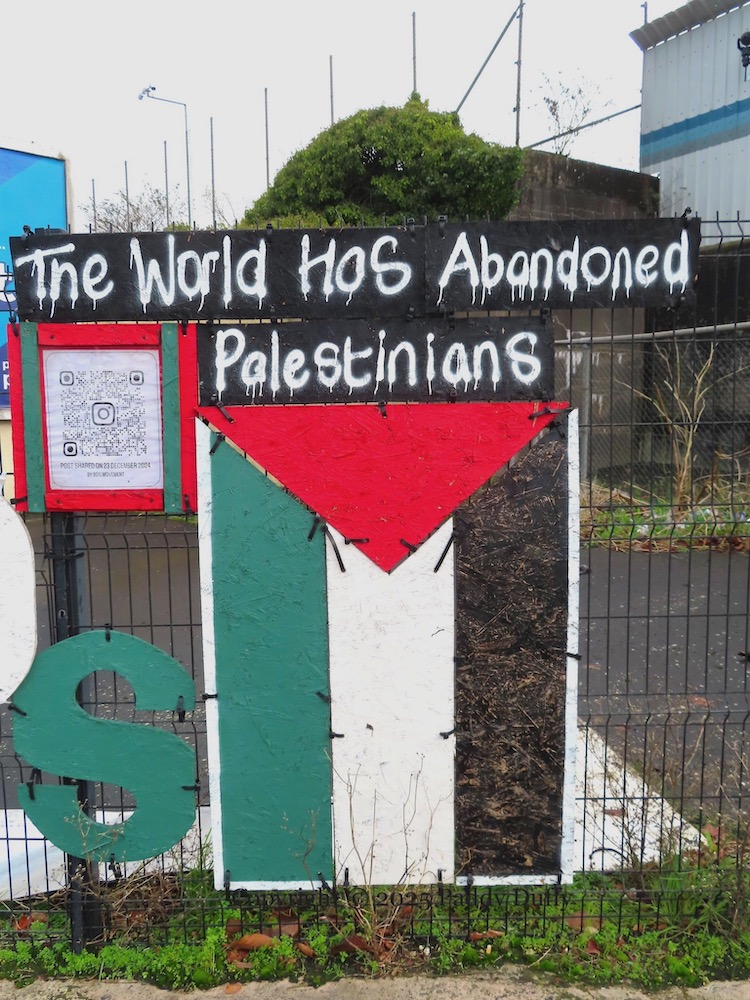 “RNU [Fb] stands with Palestine” – the board has been augmented by some knotwork corner-borders in the colours of the Palestinian and Irish flags, along with “freedom” in Irish (saoırse) and Arabic (الحرية).