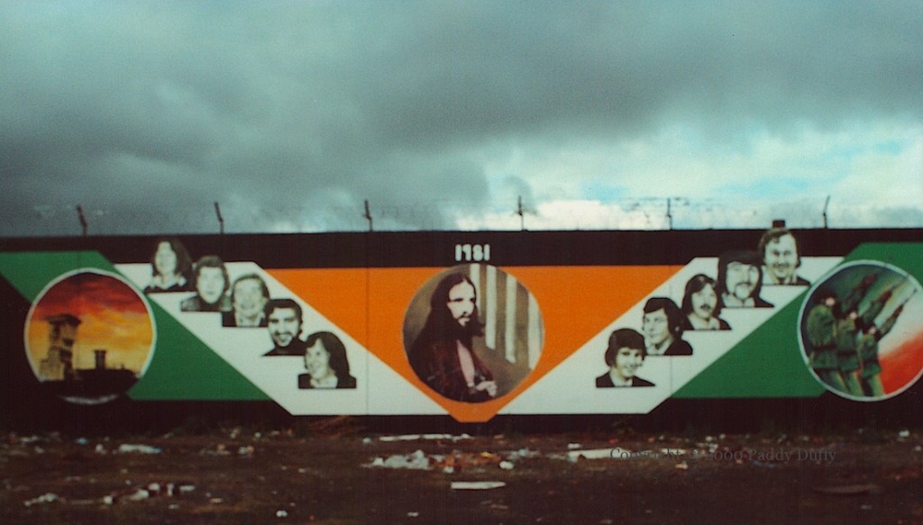 The piece is next to a hunger-strikers commemoration piece with ten portraits on shaped wooden boards against a painted background with blanket-man Hugh Rooney in the center. Between the two is a “spirit of freedom” lark and the names of the ten deceased 1981 strikers.