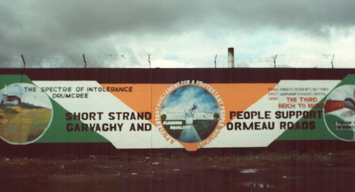 “Short Strand people support Garvaghy and Ormeau Roads.” On the left: The spectre of intolerance – Drumcree.” Centre: “A Protestant parliament for a Protestant people no more!” On the right “1996: Ormeau residents battered; 1997: Garvaghy residents beaten; 1998: The third reich to march.” and “Fascism lives! in Portadown”.