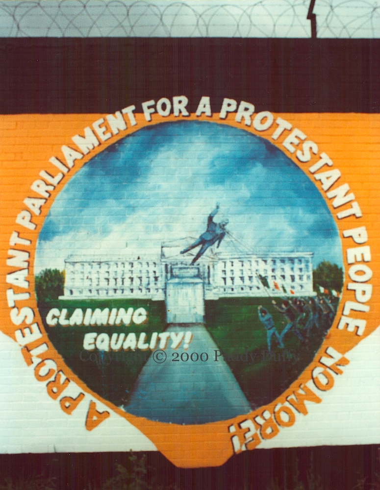 Northern Ireland’s first Prime Minister, James Craig, said in 1934, that Stormont was “carrying on a Protestant Government for a Protestant People” (NI Parliamentary Debates), though the phrase has now been transformed into the doubly alliterative “A Protestant parliament for a Protestant people”. In the centre of a long mural at the waste-ground at the top of Mountpottinger Road, people carrying Irish Tricolours tear down the statue to Northern Ireland’s most prominent leader, Sir Edward Carson, that stands outside Stormont, “claiming equality”.