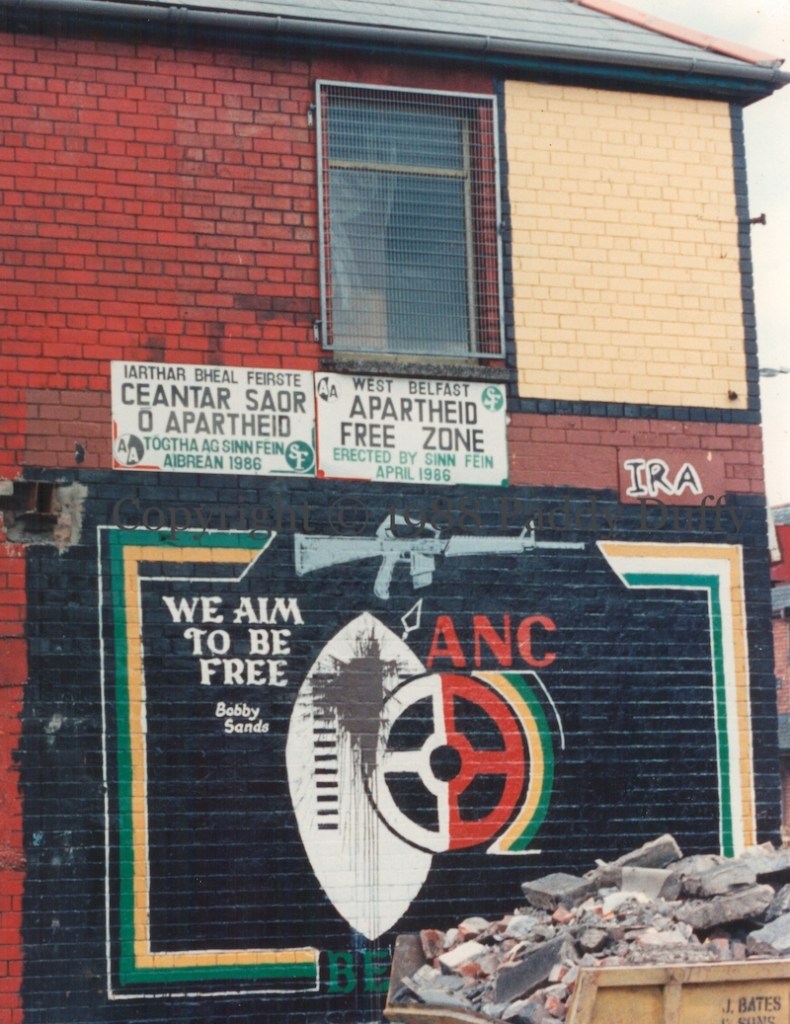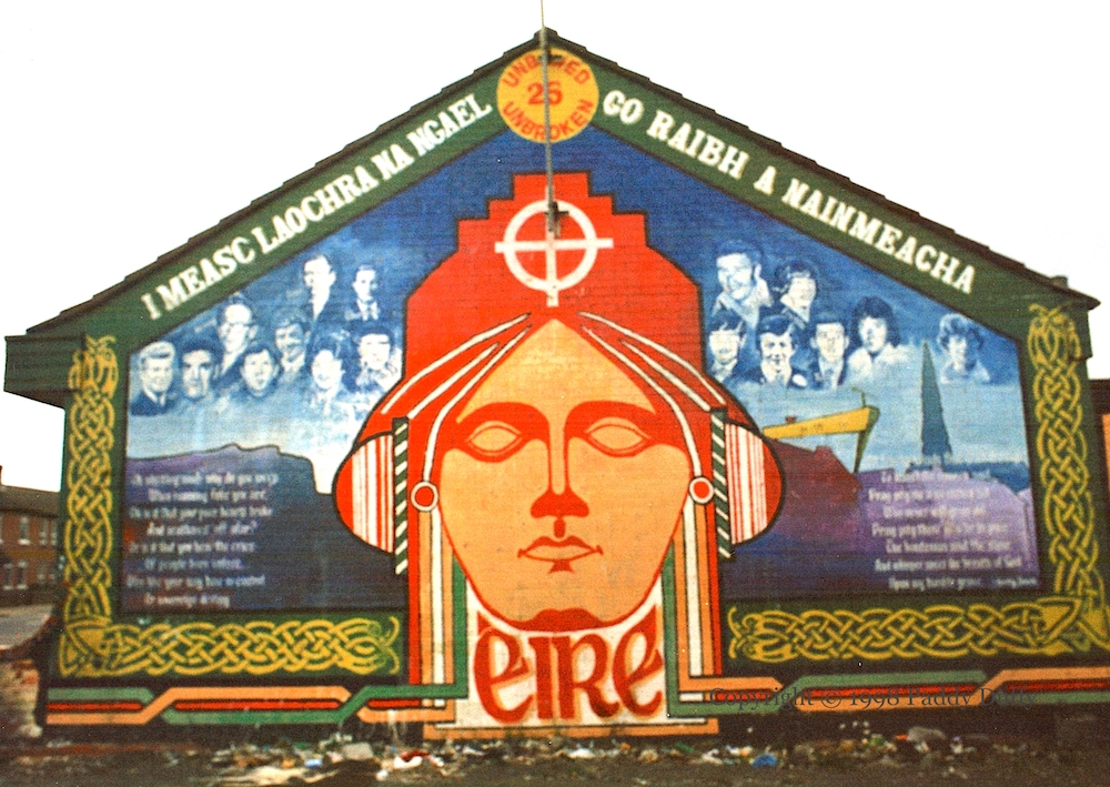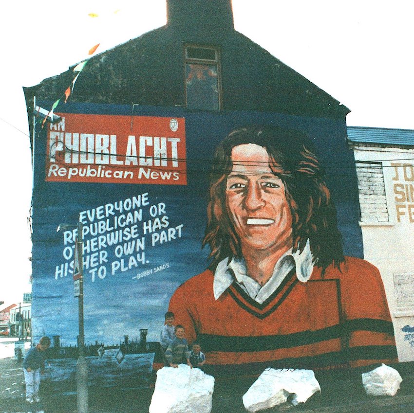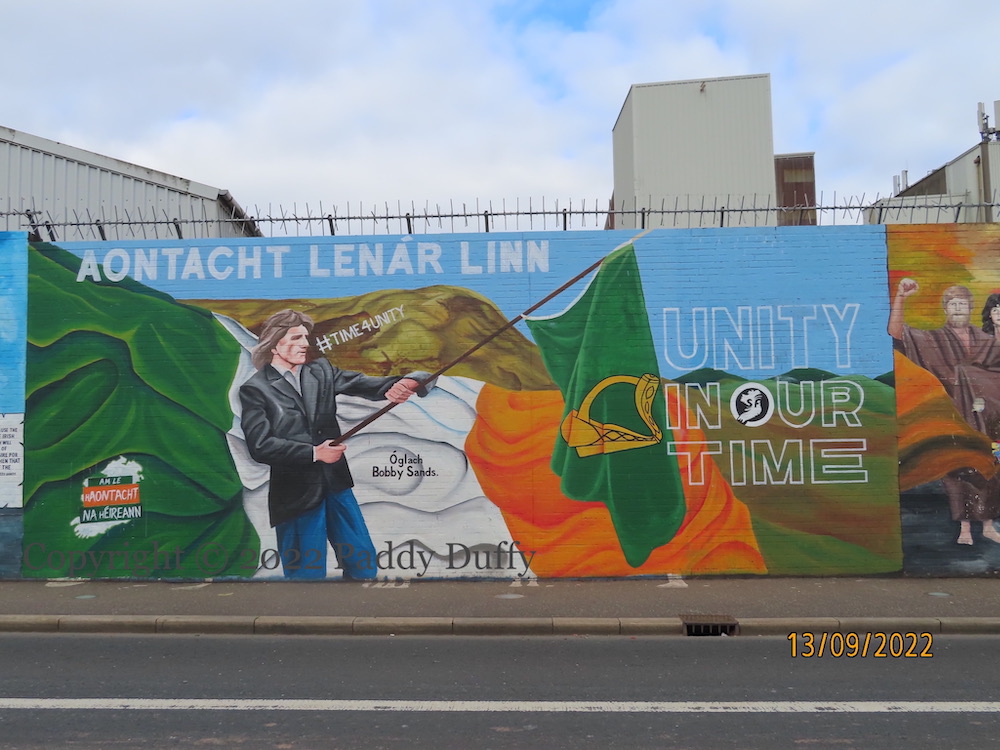 “Am le haontacht na hÉıreann” [Time for Irish unity]. Between stints in prison in 1976, Bobby Sands carried a green harp flag – symbol of Ireland and in particular of the United Irishmen – in an August march to protest the withdrawal of political status (Gérard Harlay/Bobby Sands Trust). He is shown here marching under the #TimeForUnity message on Slıabh Dubh in the campaign for a border poll and Irish unity “lenár lınn”/”in our time” (Fb | tw).
