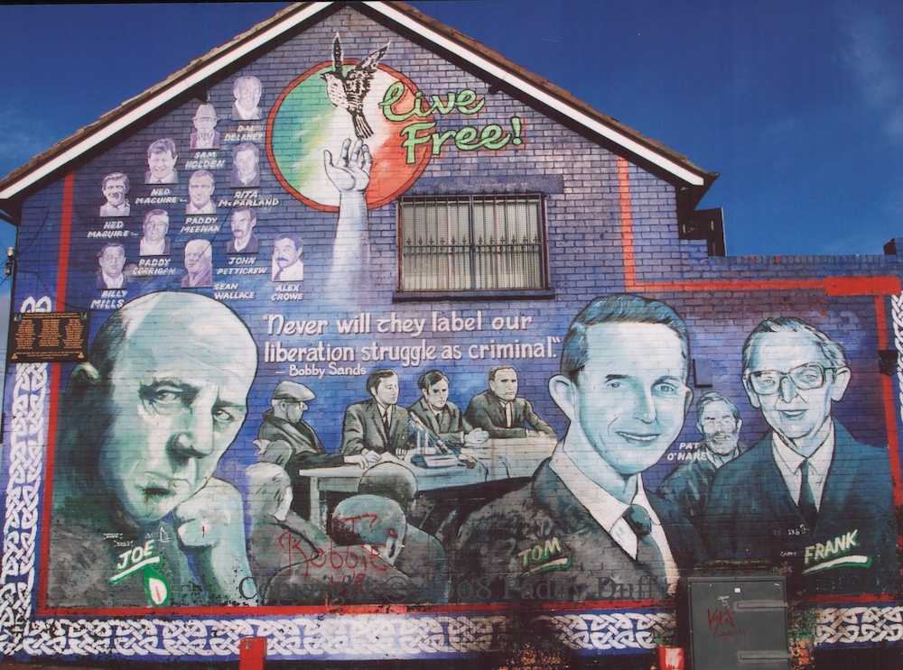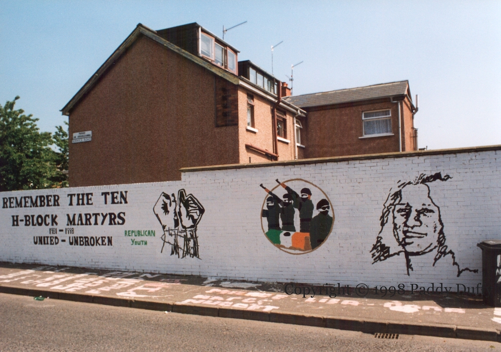 “Am le haontacht na hÉıreann” [Time for Irish unity]. Between stints in prison in 1976, Bobby Sands carried a green harp flag – symbol of Ireland and in particular of the United Irishmen – in an August march to protest the withdrawal of political status (Gérard Harlay/Bobby Sands Trust). He is shown here marching under the #TimeForUnity message on Slıabh Dubh in the campaign for a border poll and Irish unity “lenár lınn”/”in our time” (Fb | tw).