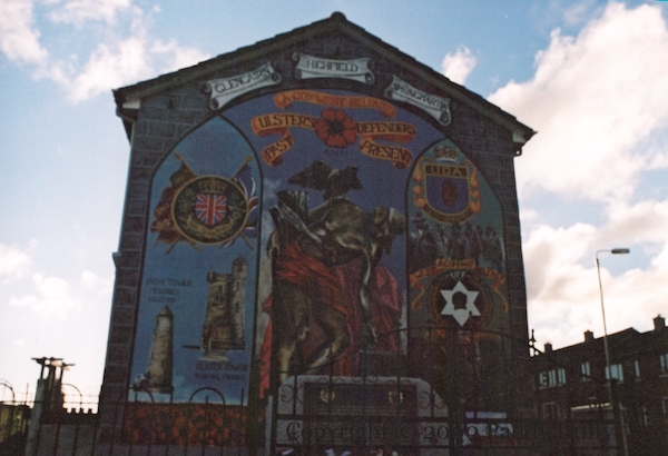 Ulster’s defenders, past and present, from Cuchulainn “Ancient defender of Ulster from Gael attacks”, via the 1893 UDU and WWI soldiers memorialised in the towers at Messines and Thiepval, to the modern UDA/UFF: “In memory of the officers and volunteers of A. Coy. [“Glencairn, Highfield, Springmartin”] UDA/UFF West Belfast Brigade who unselfishly dedicated their lives in defence of their country.”