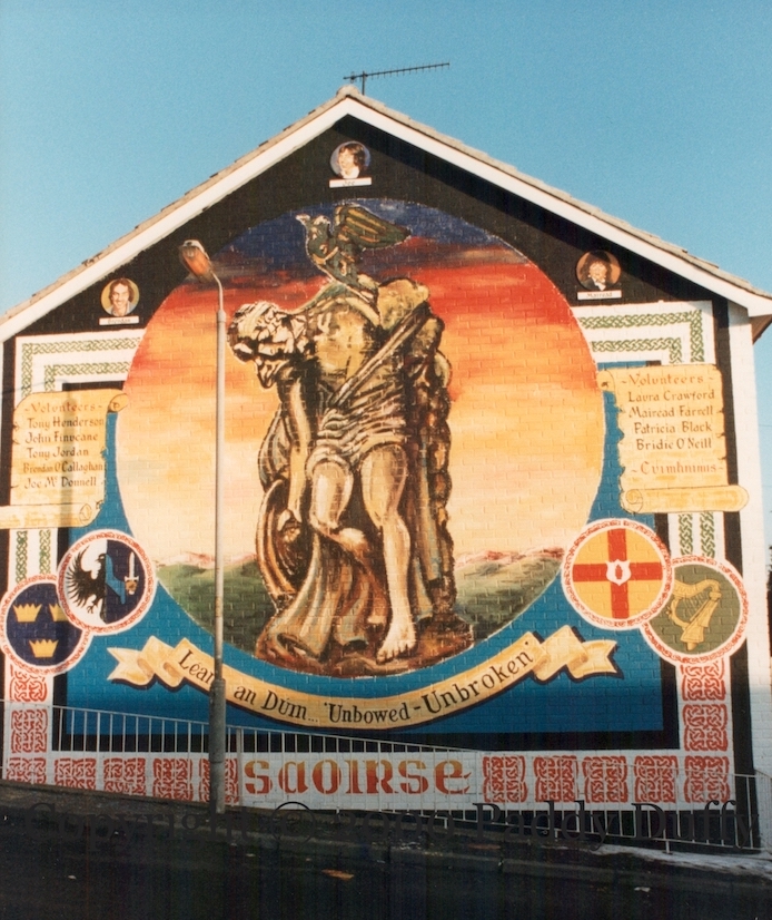 The dying Cú Chulaınn (as portrayed in bronze by Oliver Sheppard, in a statue installed in the GPO in 1935) is used as a symbol for the locals from Lenadoon area of west Belfast who fought for freedom (“saoırse”): Tony Henderson, John Finucane, Brendan O’Callaghan, Joe McDonnell, Laura Crawford, Maıréad Farrell, Patricia Black, Bridie O’Neill (subsequently changed to Bridie Quinn).