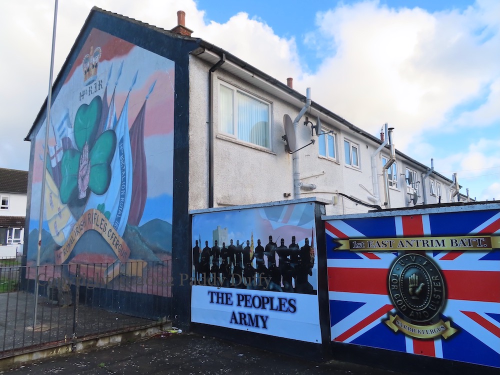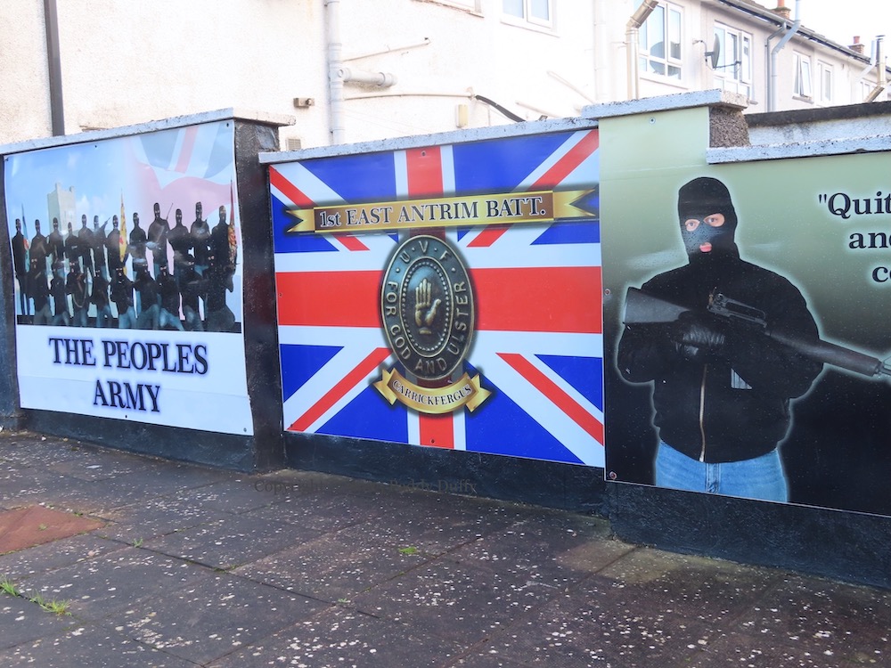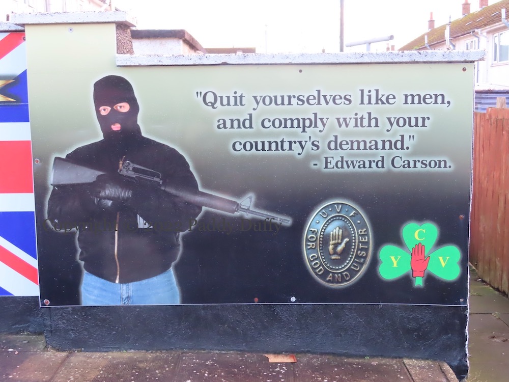 The new panels shown here re-re-image the side-wall of the mural on the left (see For Valour), which was dedicated to the Royal Irish Rifles of the Great War. We now see hooded UVF gunmen from the 1st East Antrim battalion, and an interesting quote from Edward Carson.