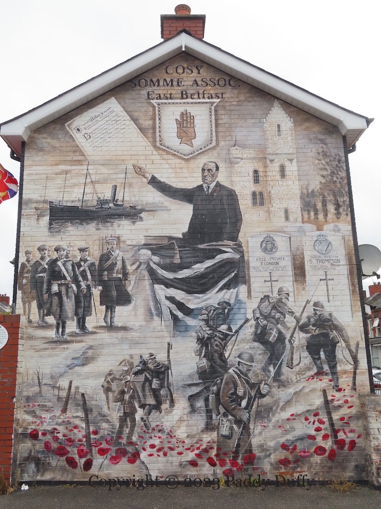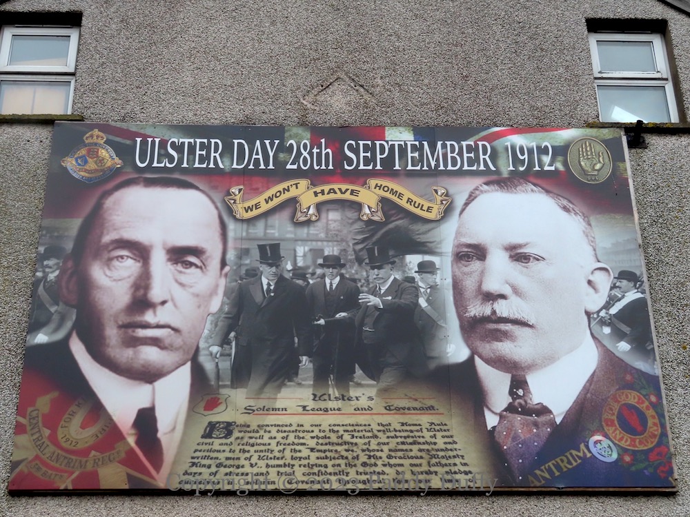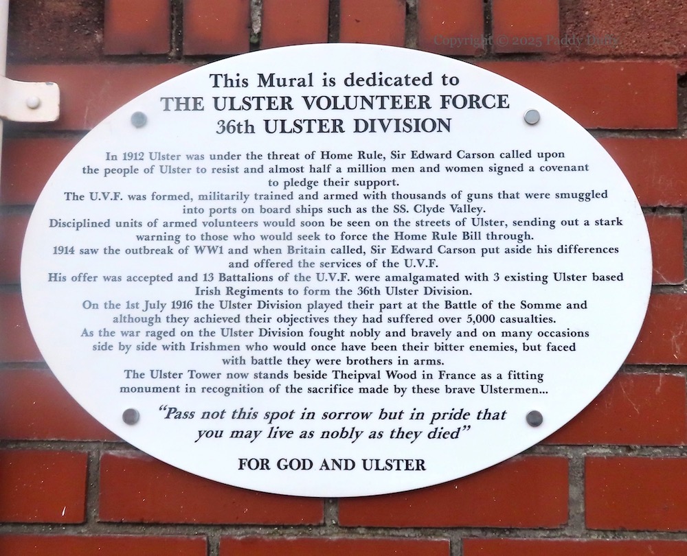 “This mural is dedicated to the men and women of Willowfield. In 1912 the 3rd Home Rule bill was introduced and passed by Parliament, and although defeated 3 times by the house of Lords it was sent for Royal assent. On 9th April 1912 over 200,000 unionists attended a rally at Balmoral including the Orange Order and Unionist Clubs which had marched from the city centre. Here they were addressed by among others, Sir Edward Carson, leader of the Irish Unionist Party. On 28th September nearly 500,000 men and women signed the Ulster Covenant. Factories and the Shipyard in Belfast were idle and silent, allowing their workers the opportunity to attend church and then to congregate at the City Hall. 3,242 men and women from Willowfield signed the Covenant, some in their own blood. They then formed into the 2nd Willowfield Battalion of the East Belfast Regiment U.V.F. commanded by Dr. William Gibson. They drilled and trained in the Willowfield Unionist Club that was situated about half a mile from this spot. With the onset of WW1 in 1914, these same volunteers stood to the fore to defend the Empire as the 8th battalion (East Belfast) in the 36th Ulster Division. Many did not return but their bravery and honour will forever be remembered.”