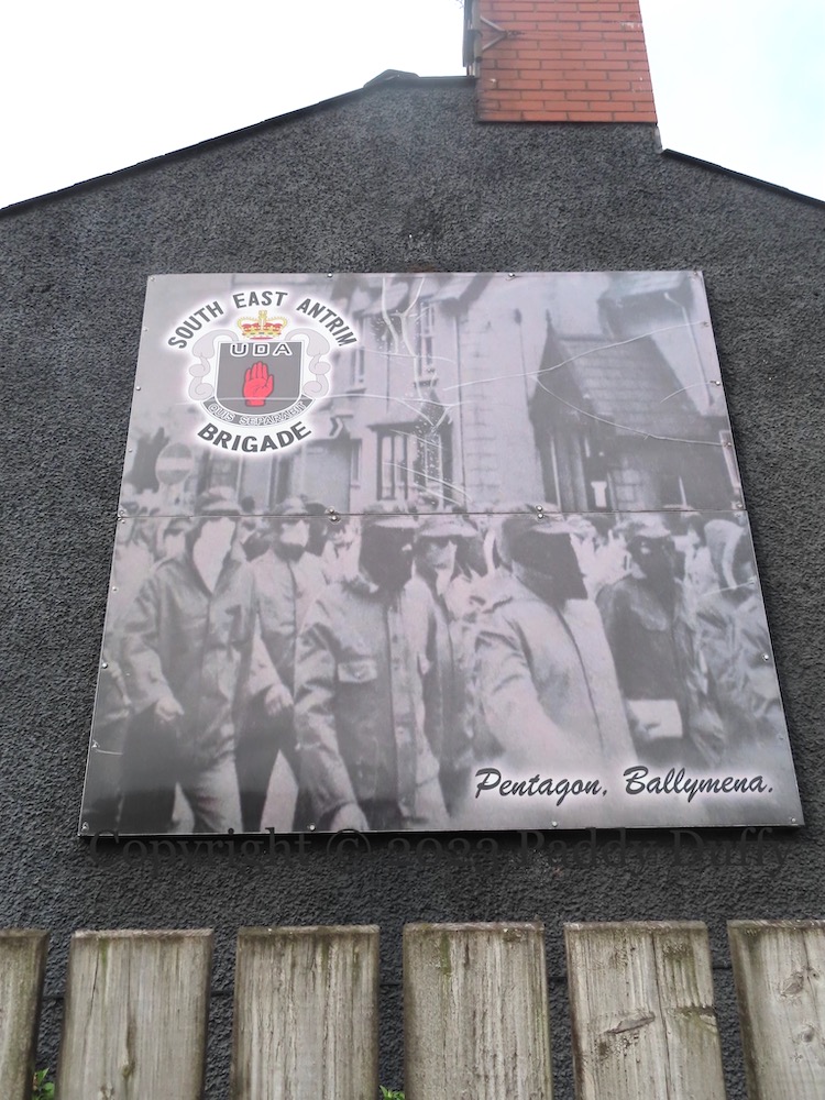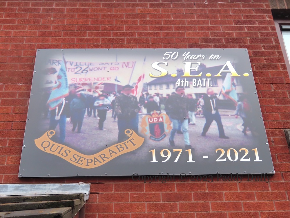 The name “Ulster Defence Union” is being used by some anti-Agreement factions of the UDA as a name for the organisation (starting in 2007 – see WDA on Peter’s site). The second board, just below, is a 4th Battalion South East Antrim UDA/UDU board. The UDA was formed in September 1971 and hence was 50 years old in 2021. The remaining two images show the UDA on parade at Harryville Bridge and in front of Pentagon House.