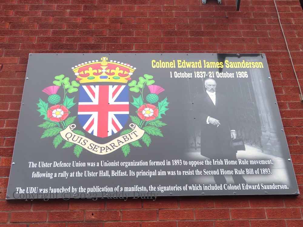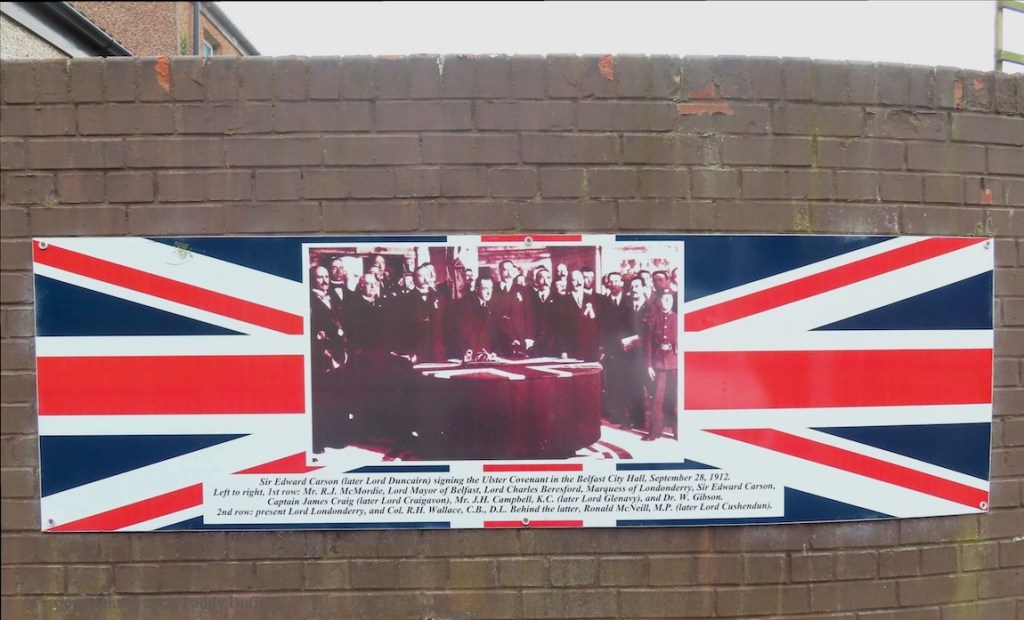 Here is a gallery of six boards from Harryville (four from Larne St/Larne Rd and two from Queen Street). The newest one is shown above; it celebrates Colonel Saunderson, a founder of the Ulster Defence Union, and organisation formed in 1893 to resist the second Home Rule bill. As mentioned on the board, the UDU initially met in Belfast in March and Saunderson was among the signatories of the UDU manifesto (see page 5 of the [Sydney] Freeman’s for 1893-04-29). For more on Saunderson, see Union Is Strength. The second bill was passed by the Commons but defeated in the Lords. The champions of resistence against the third Home Rule bill were Carson and Craig, shown in the penultimate image with the “Ulster Covenant” of September, 2012.