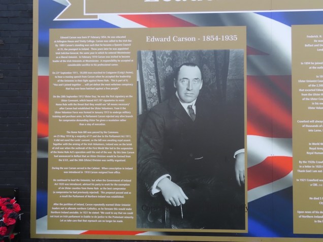 Carson, Crawford, and Craig are lionised as resisters of devolvement of Ireland to Dublin in the early twentieth century. Despite calling Home Rule “the most nefarious conspiracy that has ever been hatched against a free people” and vowing to fight it by “all means necessary”, including the Ulster Volunteers armed by Crawford’s “guns for Ulster”, Edward Carson “warned Ulster Unionist leaders not to alienate norther Catholics, as he foresaw this would make Northern Ireland unstable.”