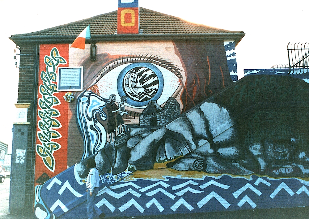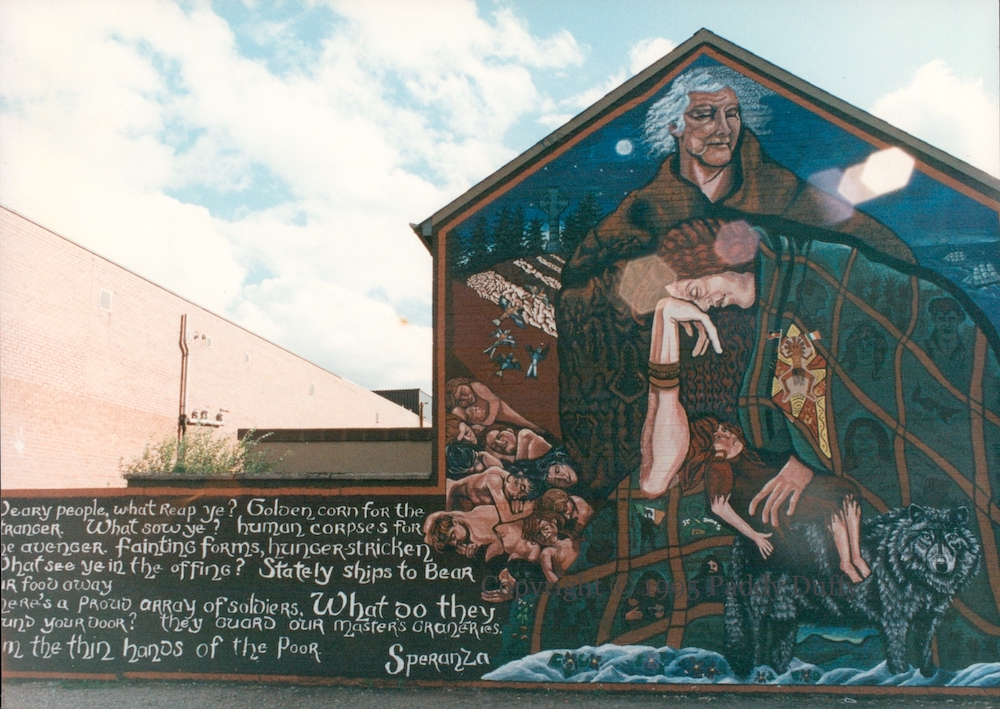 There are two side-walls out of frame to the right, going around a corner. The first gives a list of the artists in Irish (“[Dón]al Ó Dalaıḋ, [Cıa]rán [Mac] Taírnan [sic], Brían Ó Lúaın, […]rán Ó hÉır, […]áın Mac Pháıl, [perhaps one more]” (Donal Daly, Ciaran McKernan, Brian O’Loan, […] O’Hare, […] McFall. Daly, McKernan, and O’Loan would paint the History Is Written By The Winners mural in 1996) and the second reads “Dedicated to those who died in the Great Hunger” with a Celtic cross and some knotwork.