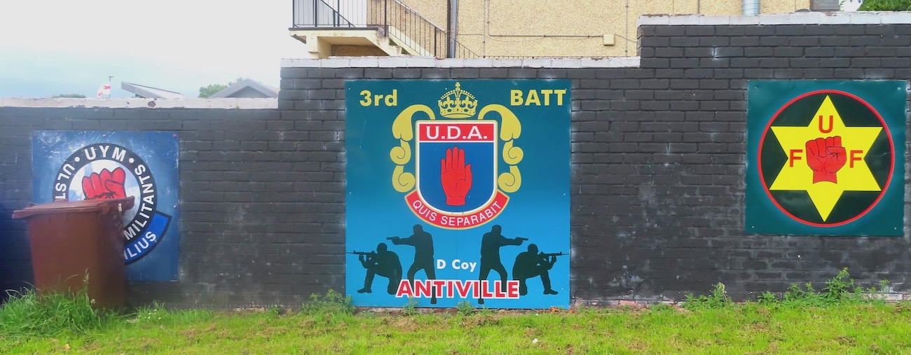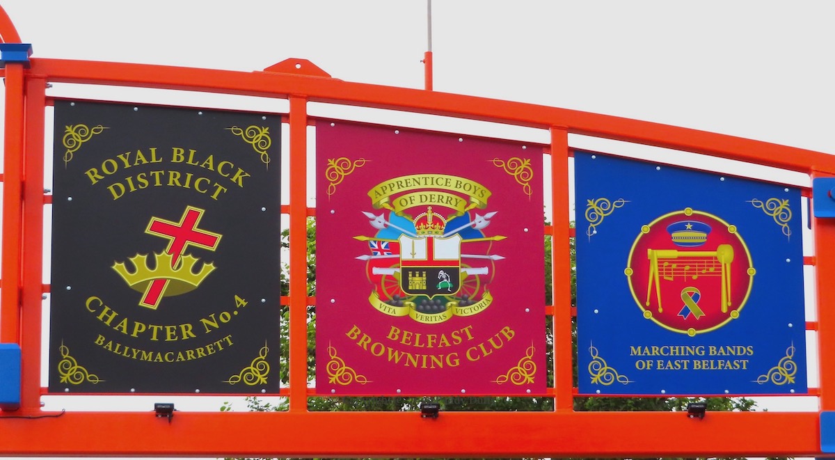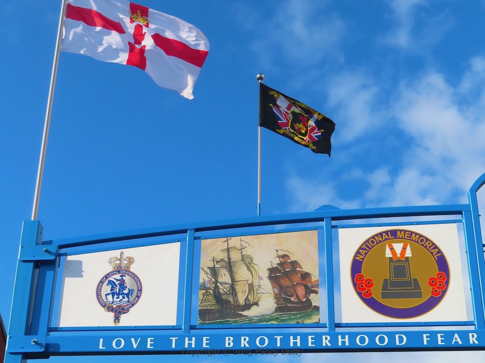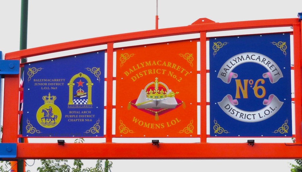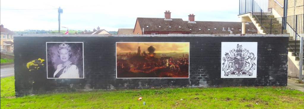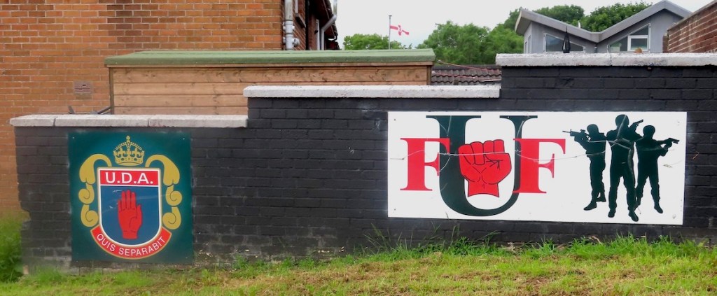 This pair of trees is in Ballymacash next to the bonfire site, hence the “No dumping and fly tipping” sign above the Union Flag on the tree to the right. The flag wrapped around the tree on the left is similar to one seen in 100 Years, an Ulster Banner with quadrants filled with (clockwise) King Billy, an Orange march, the Crown, and (instead of a Union Flag) what looks like UVF purple.