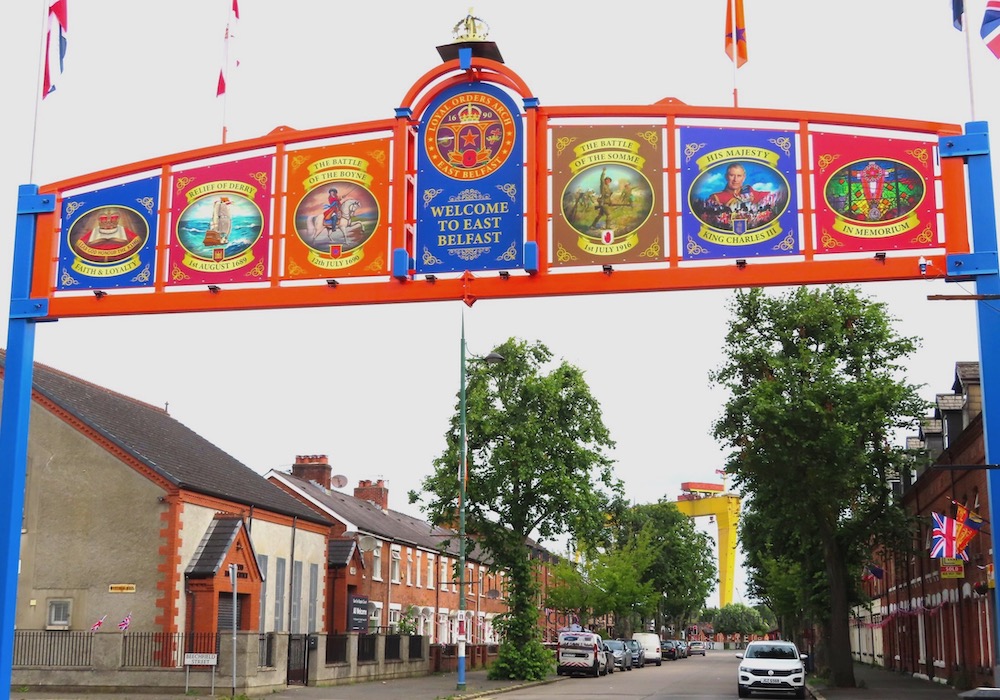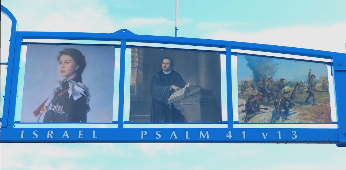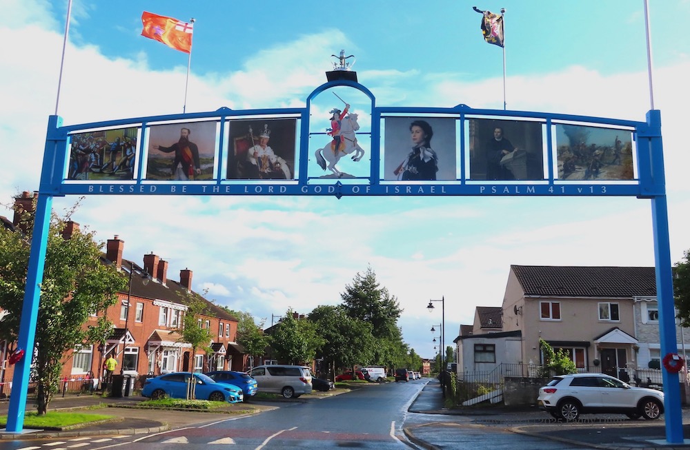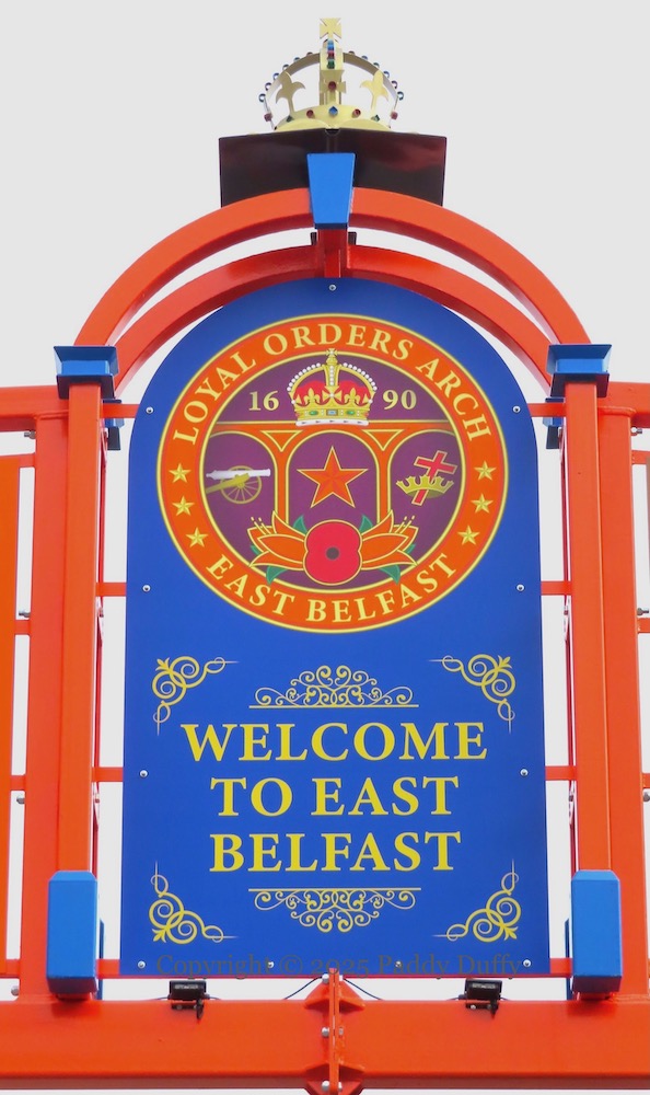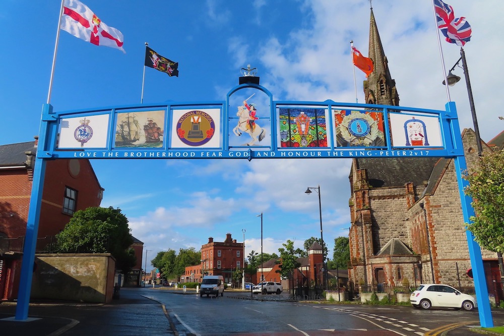 This pair of trees is in Ballymacash next to the bonfire site, hence the “No dumping and fly tipping” sign above the Union Flag on the tree to the right. The flag wrapped around the tree on the left is similar to one seen in 100 Years, an Ulster Banner with quadrants filled with (clockwise) King Billy, an Orange march, the Crown, and (instead of a Union Flag) what looks like UVF purple.