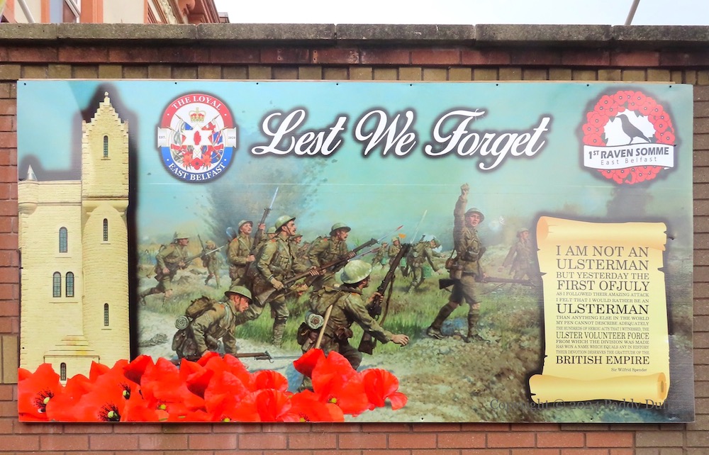 A new board was unveiled on July 1st 2024, by the 1st Raven Somme Society and The Loyal (Fb) at the Raven social club (Fb), putting together the Ulster Tower (see e.g. A Thought Is Not A Lot), JP Beadle’s painting of the 36th going ‘over the top’ (see The Trenches Have Vanished Under The Ploughs) and Wilfrid Spender’s famous quote about the first day of the Battle Of The Somme (see I Would Rather Be An Ulsterman).
