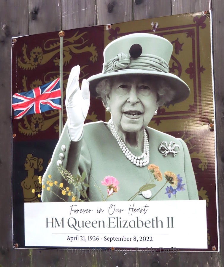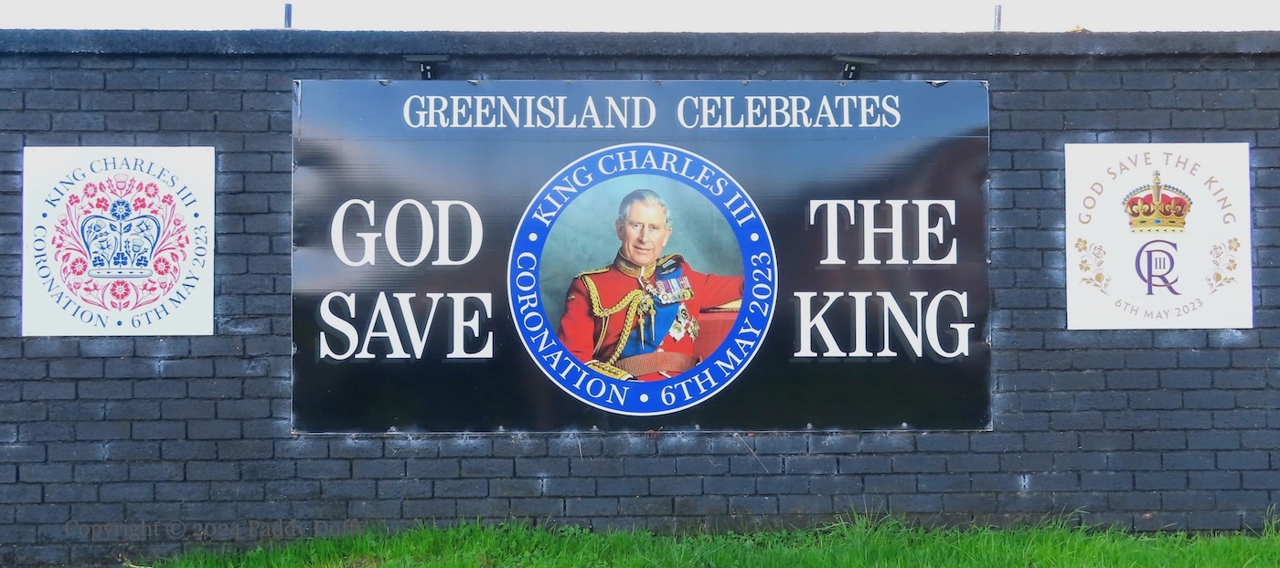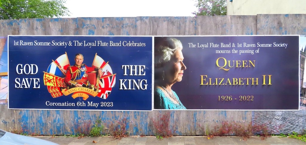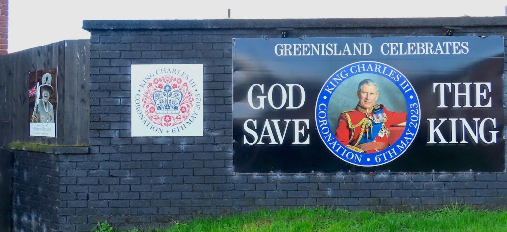 “Forever in our heart: HM Queen Elizabeth II, April 21, 1926 – September 8, 2022” and “Greenisland celebrates King Charles III, coronation 6th May, 2023.” Charles assumed (“acceded to”) the UK throne immediately upon the death of Elizabeth in September, in order to maintain the monarchy’s unbroken rule; it was not announced until the morning of the 10th (WP) and the coronation ceremony took place eight months later.