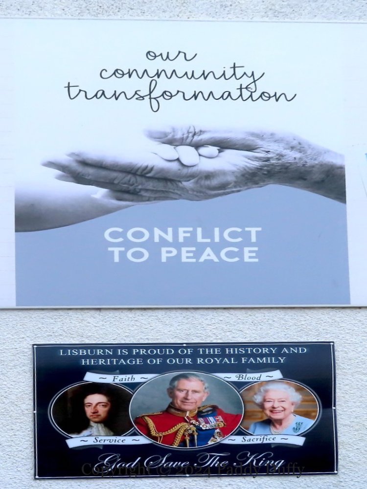 The board remembering Queen Elizabeth II below the Old Warren “community transformation” board has been updated with the accession and coronation of Charles III: “Lisburn is proud of the history and heritage of our royal family – faith, blood, service, sacrifice – God save the King” with images of William III, the present king Charles III, and his mother and predecessor Queen Elizabeth II. For a (brief!) explanation of the line from William (1689) to Elizabeth (1952), see Elizabeth, Queen Of Orange.