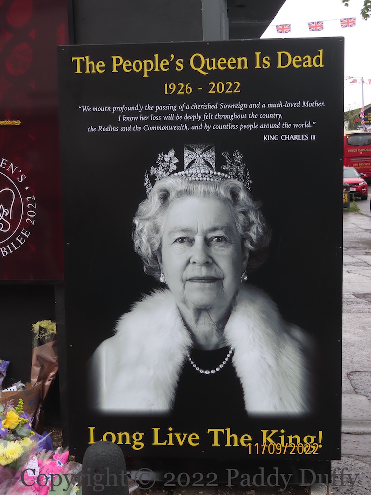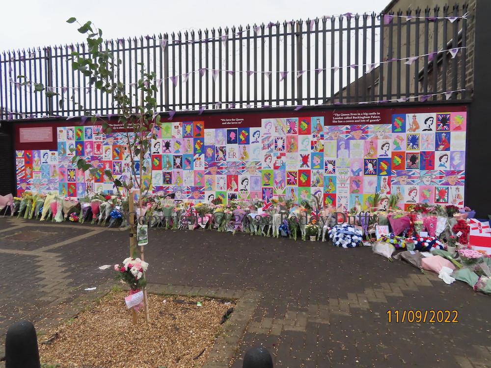 Upon news of Queen Elizabeth’s death, the platinum jubilee mural at the bottom of Crimea Street became a memorial, with hundreds of bouquets being laid before it and a “wall of condolences” set up. (For the mural itself, see The People’s Monarch.) In addition, to the right-hand side has been added a small commemoration of her passing, with a quote from her son, the newly acceded King Charles: