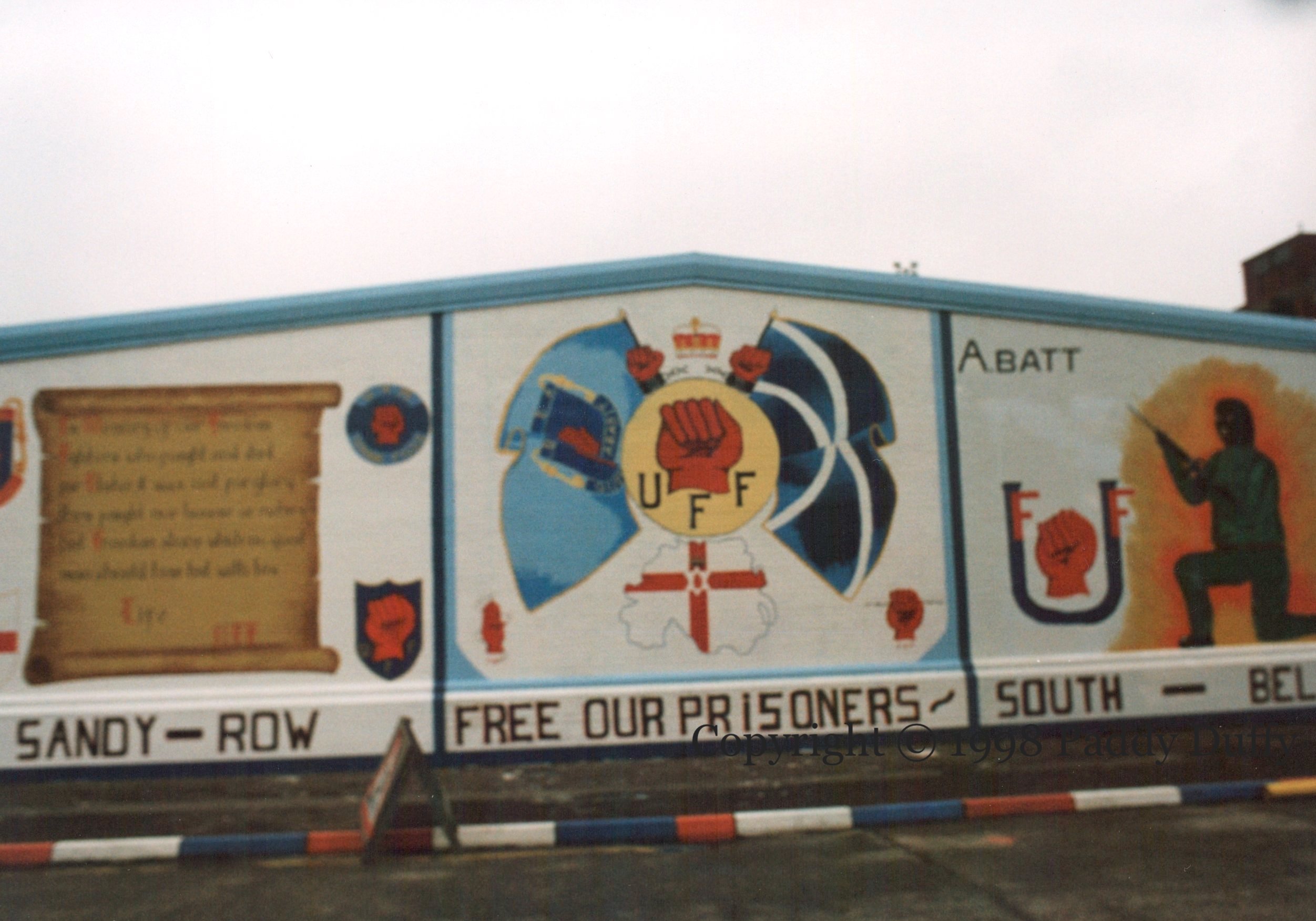 The scroll on the left between the emblems of the UDA, UYM, UFF and the Ulster banner reads, “In memory of our freedom fighters who fought and died for Ulster. It was not for glory they fought nor honour or riches but freedom alone which no good man should lose but with his life.” There is a pair of manacled red fists above the central UFF emblem, which itself rests on a free-floating outline of Northern Ireland superimposed with the Ulster banner. On the right is a crouching volunteer from A battalion, from south Belfast’s Sandy Row.