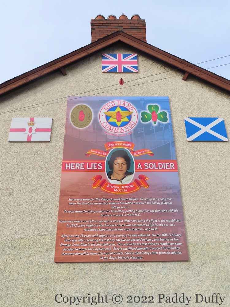 The text on the board reads: “Stevie was raised in The Village Area of South Belfast. He was just a young man when The Troubles started but without hesitation answered the call by joi[ni]ng the Village RHC. He soon started making a name for himself by putting himself on the front line with his brothers in arms in the RHC. These men where [sic] one of the most active units in Ulster by taking the fight the republicans. In 1972 at the height of The Troubles Stevie was sentenced to life for his part in a retaliation shooting and was imprisoned in Long Kesh. After serving 15 years with dignity and courage he was released. On the 16th February 1989 just after receiving his last pay cheque [from a transitional work scheme] he decided to join a few friends in The Orange Cross Club in the Shankill area. This would be his last drink as republican scum decided to target the Loyalist club. Stevie sacrificed himself to protect his friend by throwing himself in front of a hail of bullets. Stevie died 2 days later from his injuries in the Royal Victoria Hospital.”