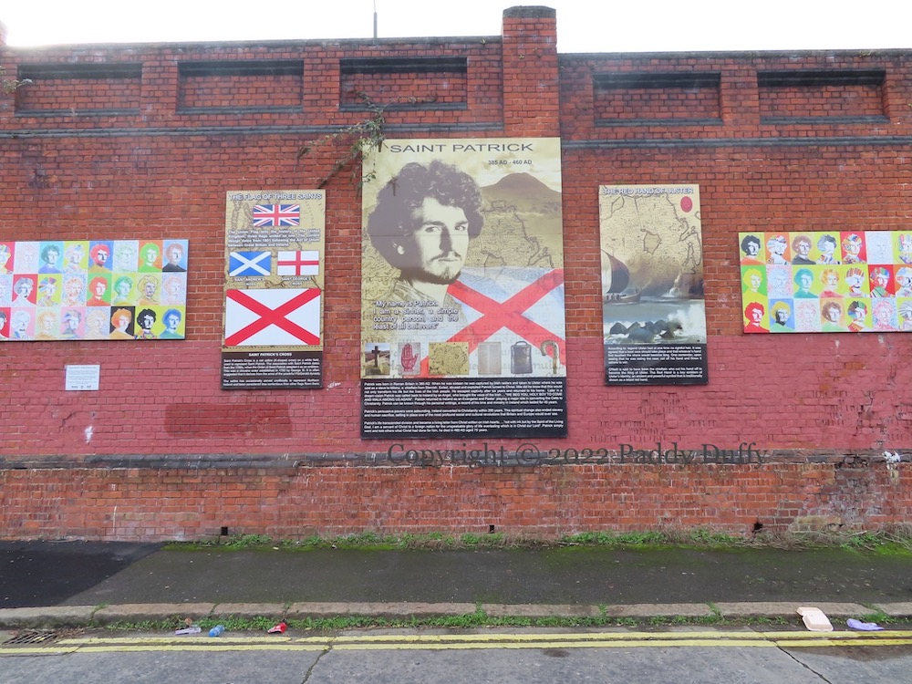 The colourings of the Saint Patrick profile are by children from the nearby Donegall Road Primary School.