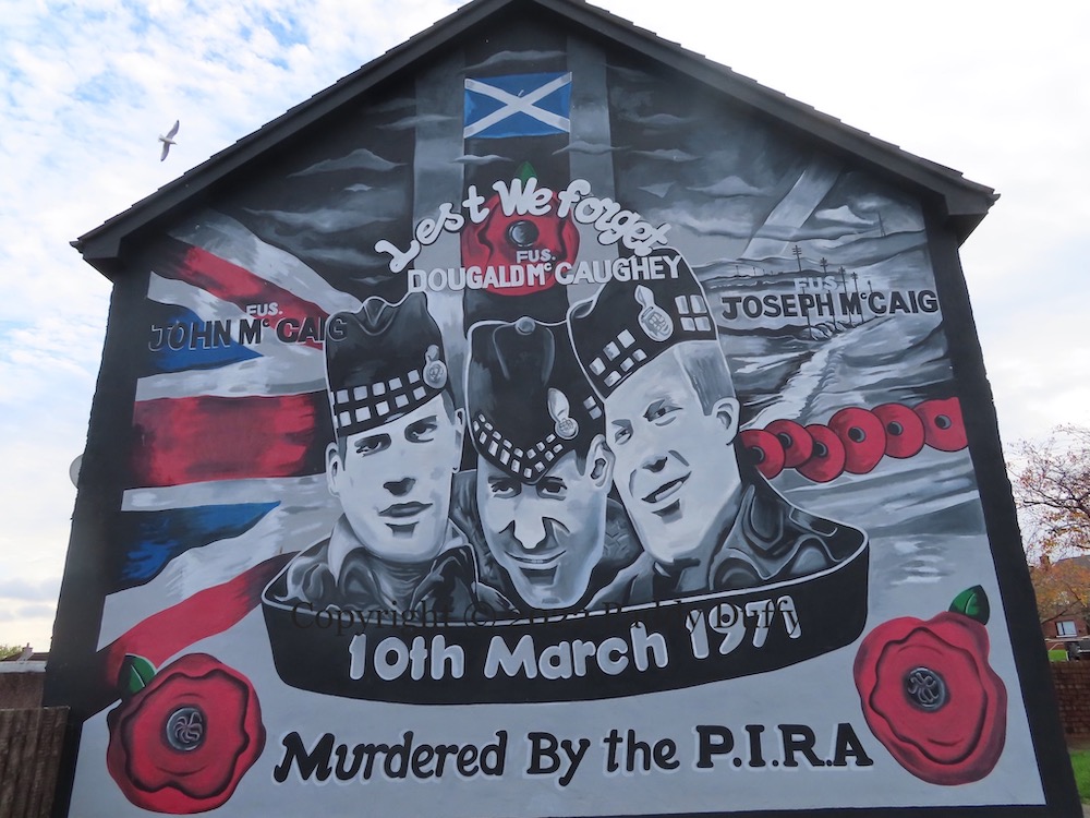 Highland Fusiliers Joseph McCaig (18), (his brother) John McCaig (17), and Dougald McCaughey (23) were lured by members of the (P)IRA from a city-centre pub to their deaths in the fields above Ligoniel in 1971 (WP). Their deaths contributed to the resignation of Chichester-Clark and the introduction of internment in August. There are monuments to the three men in Ballysillan and at the site of their deaths on White Brae depicted on the right of the mural – for images of the monuments see The Highland. This new Rathcoole mural to their memory replaces one to Queen Elizabeth II.