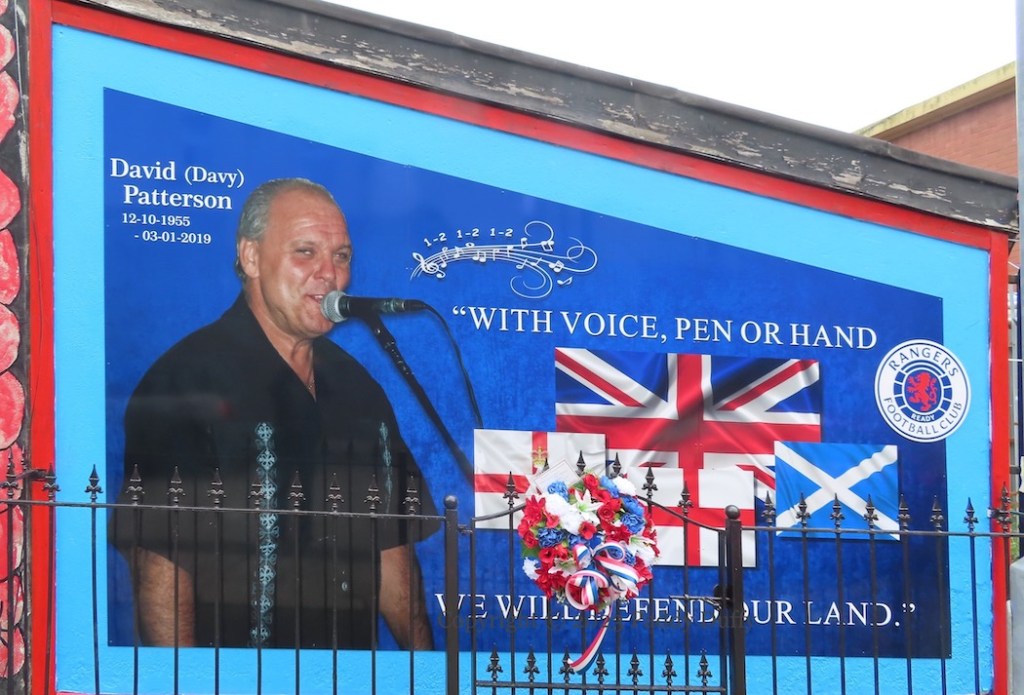 “With voice, pen or hand we will defend our land.” David (Davy) Patterson (12-10-1955 – 03-01-2019) was a member of the 1st East Belfast Rangers Supporters Club (Fb) and Albertbridge Glentoran Supporters Club (Funeral Times). This memorial board is the side-wall to the Somme Society mural (see Their Name Liveth Forevermore) and the Red Hand Commando memorial garden in Hunt Street, east Belfast.