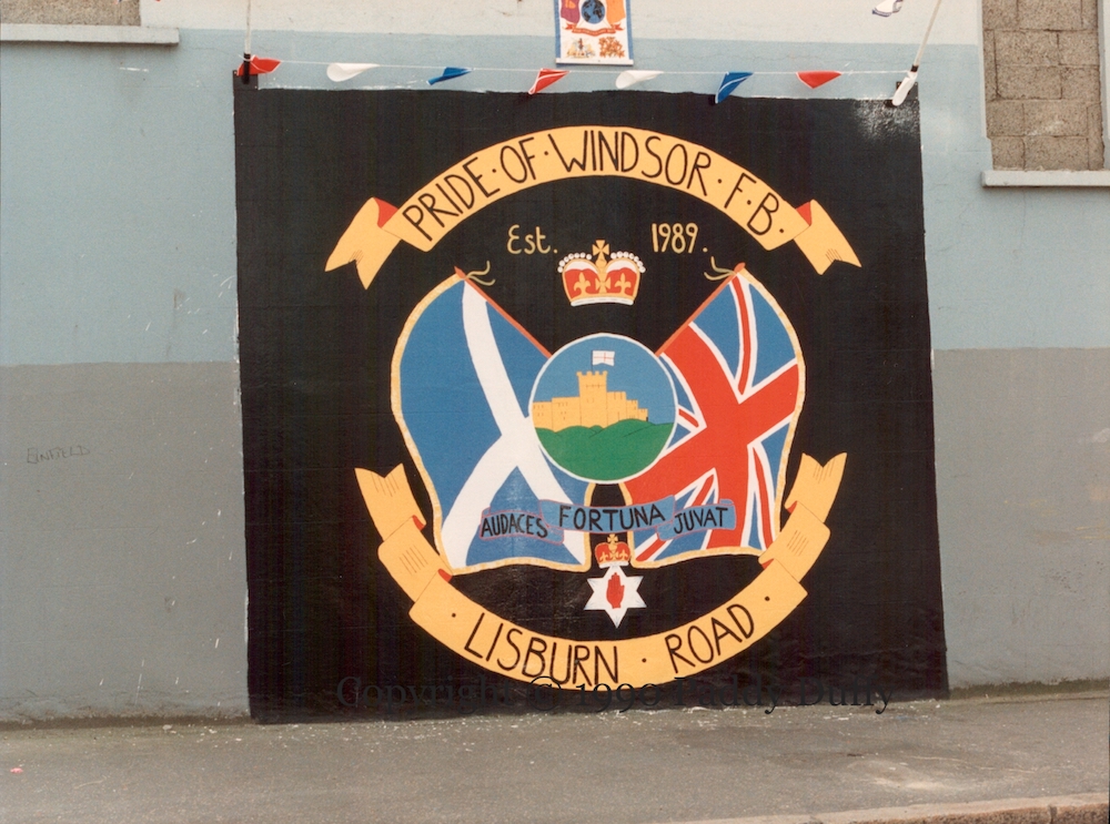 Pride Of Windsor was formed from members of the Donegall Road Protestant Boys (Belfast Forum). It’s not clear how long the band lasted after being formed in 1989 and this mural in 1990. The mural features Carrickfergus castle between St Andrew’s Saltire and Union Flag. “Audaces fortuna juvat” [fortune favours the bold] is the motto of Linfield FC.
