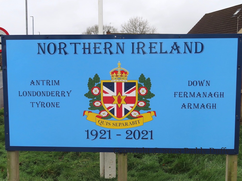 Here are two boards from Ballymacash celebrating the union with Britain and the centenary of Northern Ireland. The pair mark the western (above) and eastern (below) entrances to the estate (along with Loyalist Ballymacash). The estate is known for its large bonfire (see e.g. these images from 2018).