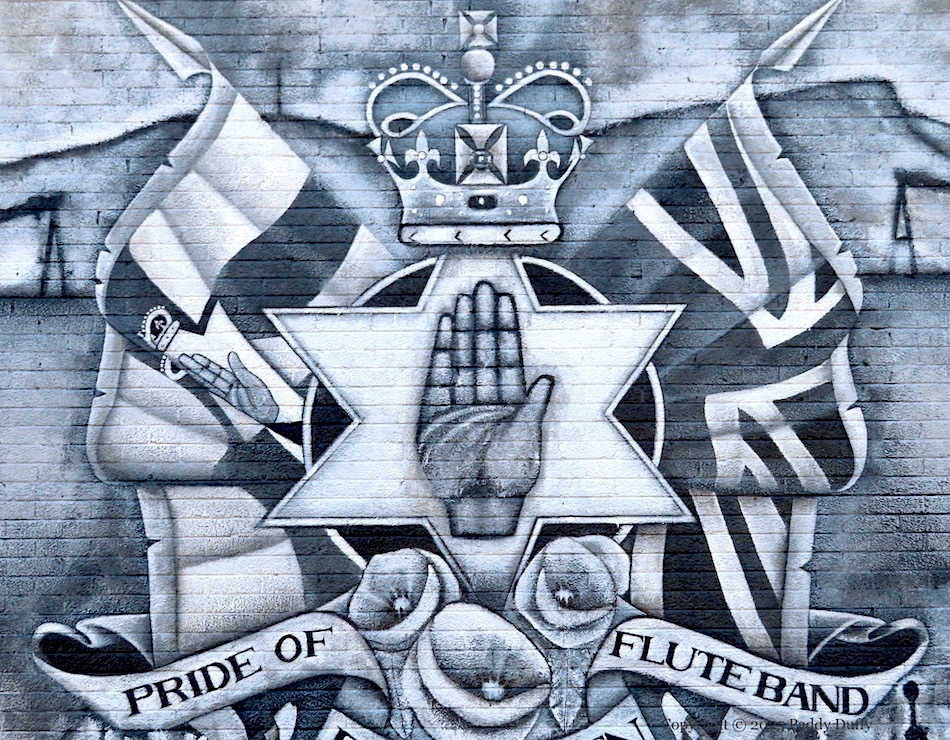 “Band Of Brothers. This artwork is a tribute to the unbreakable bond that we in North Belfast, share along with the following bands: Craigneuk [Scotland] True Defenders flute band, formed 1947 [Fb]; Andrew Murphy Memorial flute band [Scotland], formed 1988 [Fb]; City Of Belfast Fifes And Drums, formed 2003 [Fb]; Bellshill [Scotland] Defenders flute band, formed in 2017 [Fb]. For decades, these bands have remained faithful, and been a credit to the loyalist cause that binds us. When on parade, the honour and dignity displayed by each band, is impeccable. In timeless memory of the Fallen, each band proudly and respectfully bears the Colours and Emblems of: the Ulster Volunteer Force, the Young Citizen Volunteers, the 36th (Ulster) Division. ‘More than friends, comrades’.”