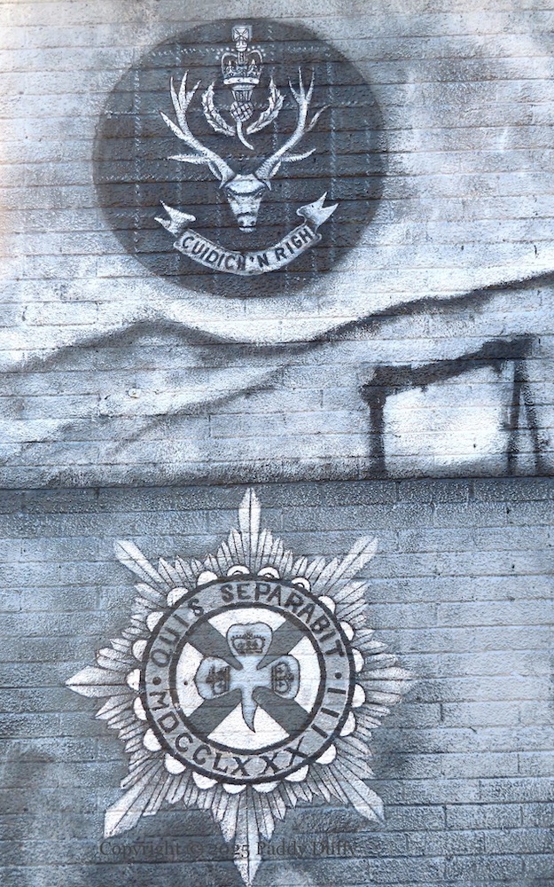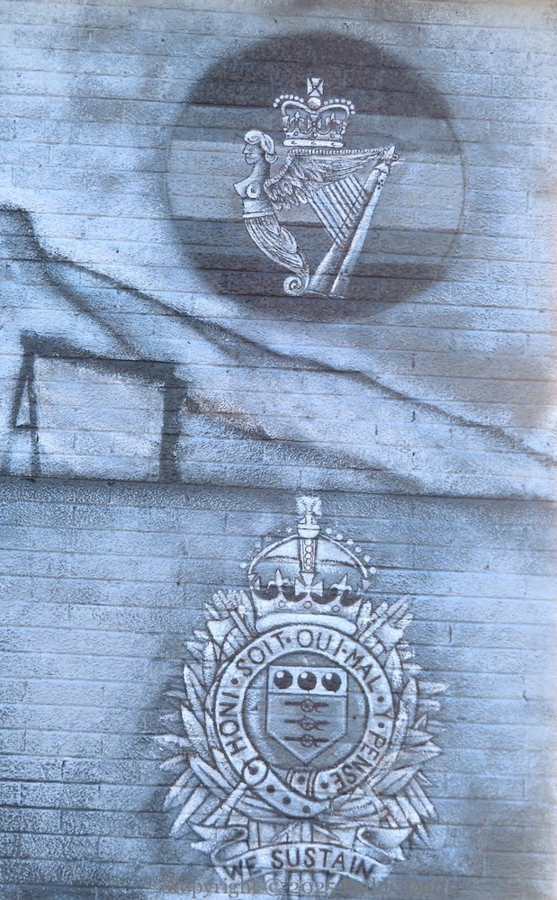 The festive atmosphere depicted along the bottom of the Pride Of Ballybeen flute band’s new mural, with people clapping and waving and doing cartwheels as the parade passes by, is in contrast with the regimental emblems in the upper part of the mural: we see (on the left-hand side; first close-up below) the Highlanders (“Cuidich’n Righ” is Scots Gaelic for “Help the king”) and the Irish Guards (motto “quis separabit”; 1783 is the year the Order Of St Patrick was created), and (right-hand side, second close-up below), the Royal Irish Regiment and the Logistics Corp (motto “Honi soit qui mal y pense“). These are perhaps regiments in which band-members serve or have served; the band does not have a (public) internet presence.